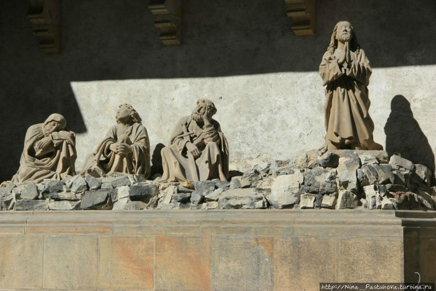 Некогда костелу Святого Маврикия принадлежала скульптурная композиция из четырех отдельных статуй под названием «Христос на Елеонской горе». Они изображали молящегося Христа, а также апостолов Петра, Иоанна, Иакова. Они были изготовлены из песчаника в 30-ые годы XV века, и до 1784 года располагались на стене кладбища у костела Святого Маврикия, но после закрытия и сноса кладбища скульптуры перенесли на каменный постамент у южной стены храма. В 1985 году статуи повредили вандалы, и их перенесли в храм. С 1999 года они выставляются в музее Художеств Оломоуца, а также их можно было увидеть среди экспонатов выставки в Риме. С 2006 года скульптуры попадают в коллекцию Архиепископского музея, а в костел Святого Маврикия (на постамент у южной стены) возвращают их копии.