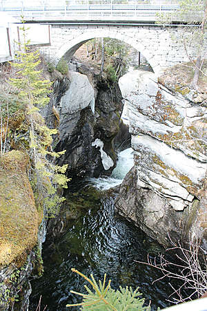 За многие годы в этом месте река Valldøla промыла 25 метровой глубины ущелье. Прямо над ним проложены железные мостки. Вода с этой высоты устремляется вниз, создавая тем самым водопад. Мостки позволяют обойти все ущелье по краю, а вид с автомобильного моста получается наиболее интересным. Здесь же находится кафе со смотровой площадкой.