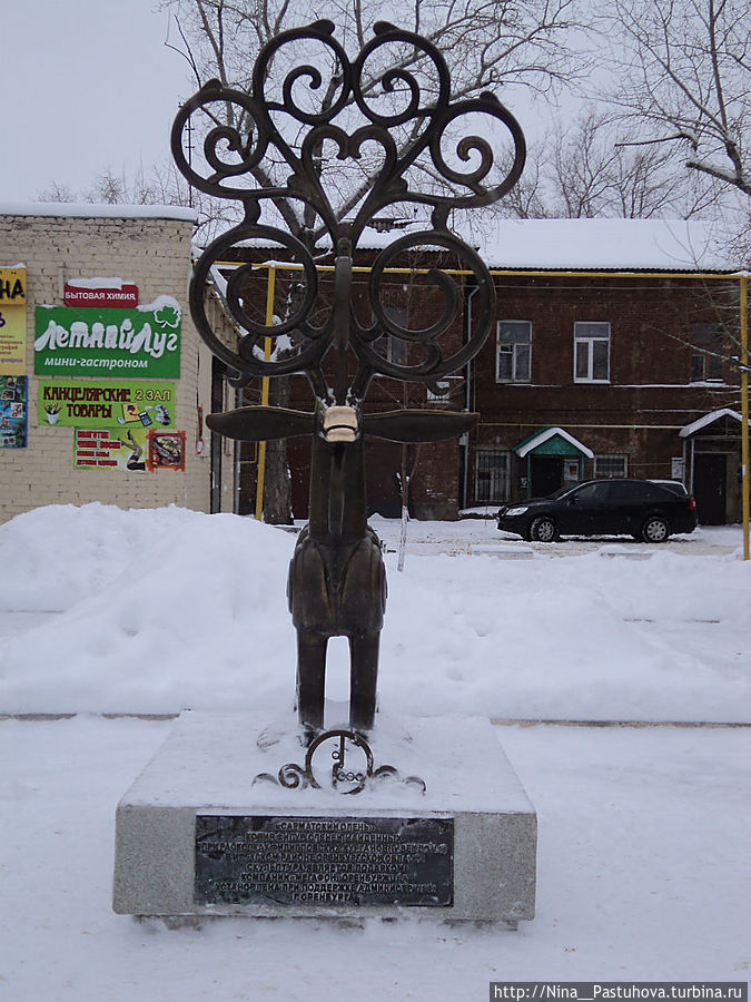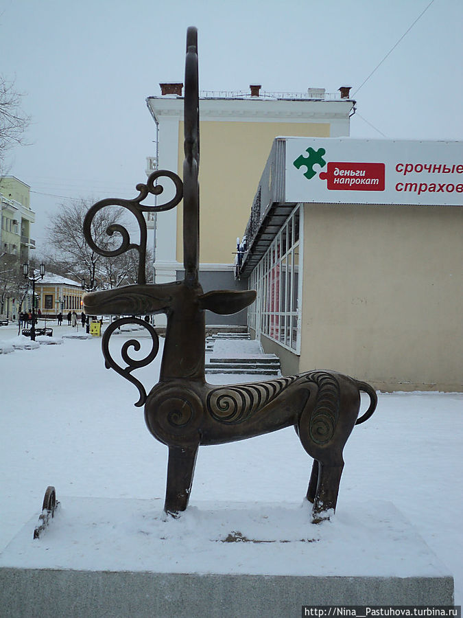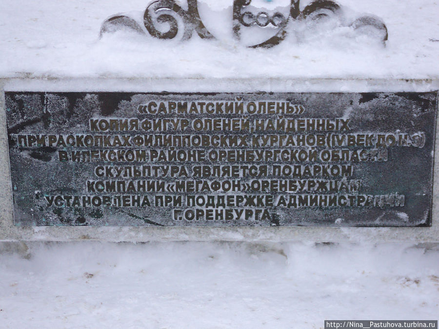 — золотой сарматский олень. Скульптура является точной копией фигурки оленя, найденной при раскопках на Филипповских курганах в Илекском районе Оренбургской области. Благородное животное было священным для скифо-сарматов, населявших в V–IV веках до н. э. оренбургские степи: считалось, что олень приносит удачу, здоровье, силу и оберегает любовь того, кто до него дотронется.