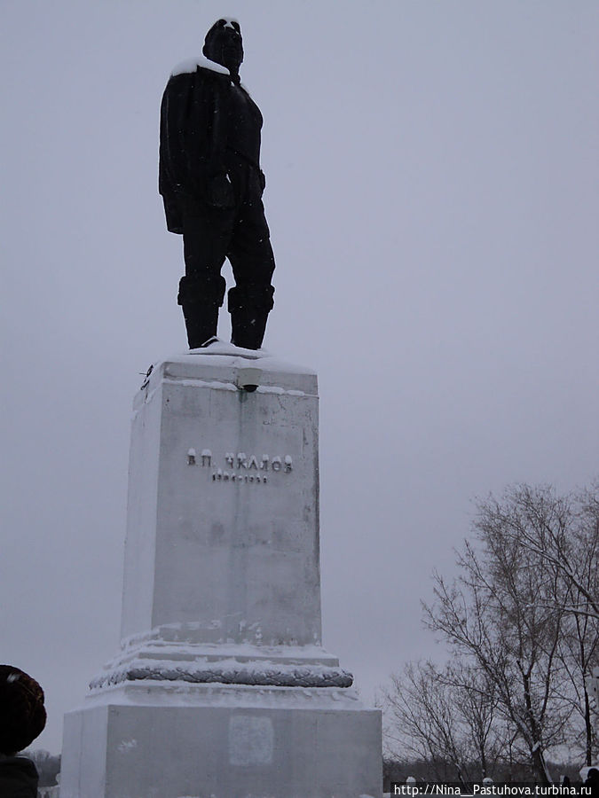 Здесь же на набережной установлен памятник и В. П. Чкалову. 7 ноября 1953 года, когда вся страна отмечала 36-ю годовщину Великой Октябрьской социалистической революции, на высоком берегу Урала, около Военного авиационного училища летчиков, открыт памятник выдающемуся летчику нашего времени Валерию Павловичу Чкалову. Валерий Чкалов был выпускником военно-авиационного училища, которое в тридцатые годы обосновалось в Оренбурге. Имя его ещё до установления памятника было вписано в историю города — с 1938 по 1957 год Оренбург назывался Чкалов.