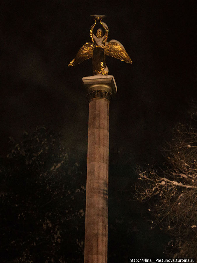 Композиция представляет собой фигуру трехметрового золотого ангела-хранителя с голубем в руках, на шестиметровой четырехгранной колонне. Ангел, ступающий по полусфере, олицетворяет Землю, а голубь в его руках — это символ Мира и Надежды. Всю эту конструкцию поддерживает квадратный пьедестал высотой около трех метров, с высеченным текстом на всех четырех сторонах. На передней стороне — довольно объемный текст, гласящий о самой композиции. Здесь же высечены имена авторов художественной концепции комплекса — это О.В. Олейник, президент международного Союза благотворительных организаций "Мир Добра" и П.Т. Стронский, президент международной академии культуры и искусства.