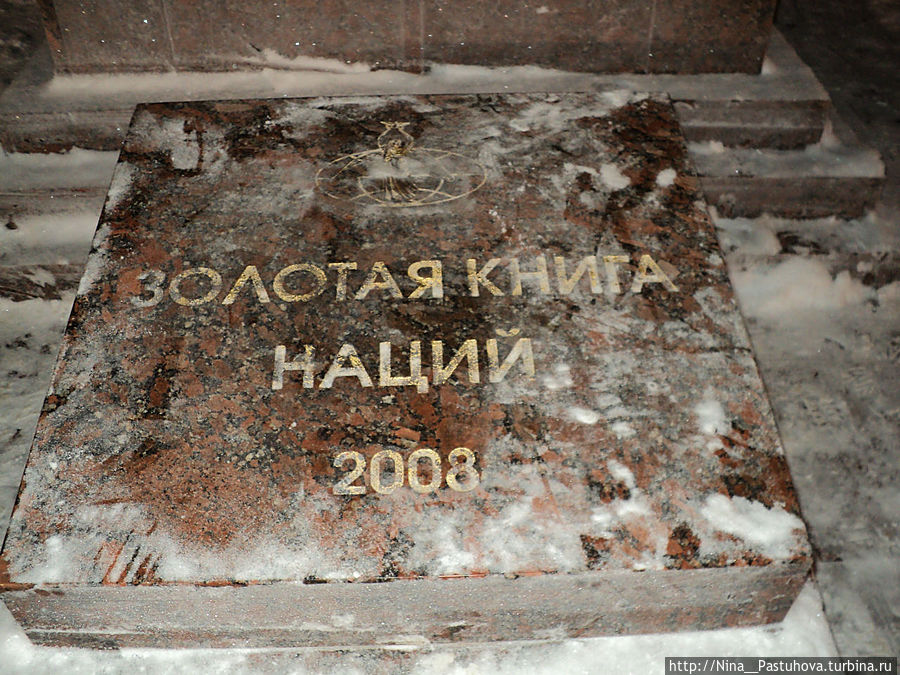 Перед пьедесталом стилизованное изображение в форме развернутой книги с надписью: "Золотая книга наций".