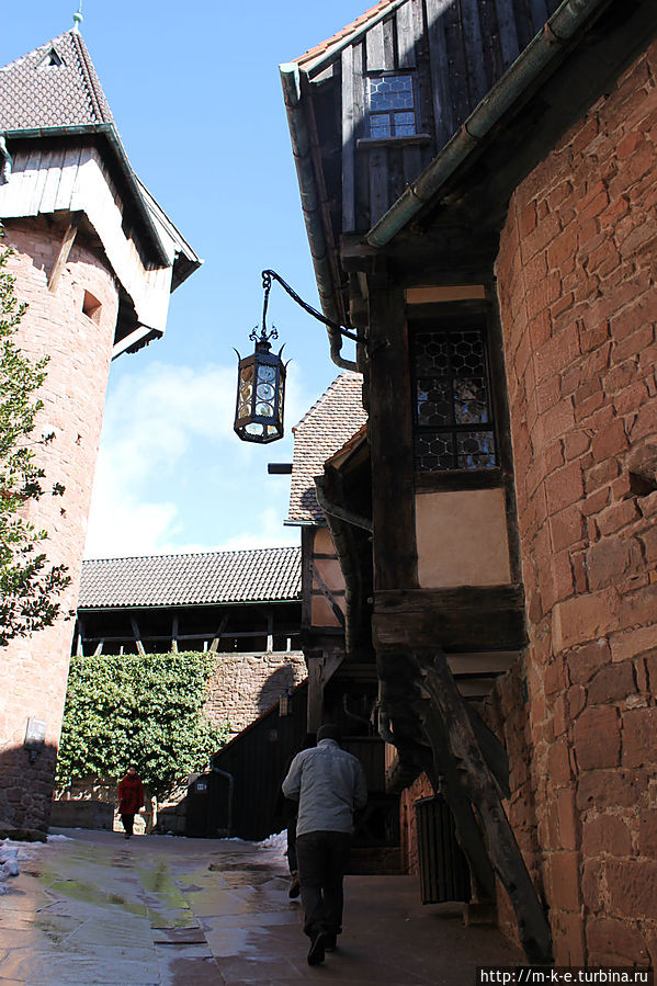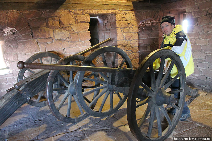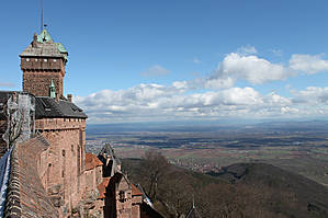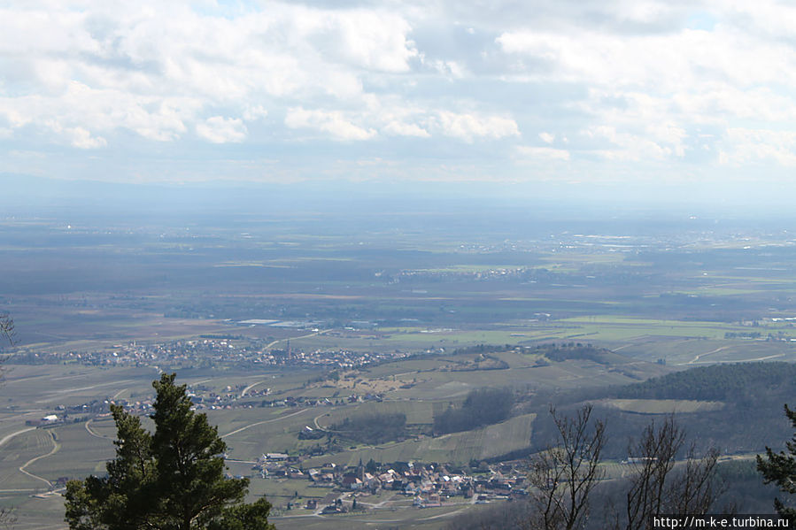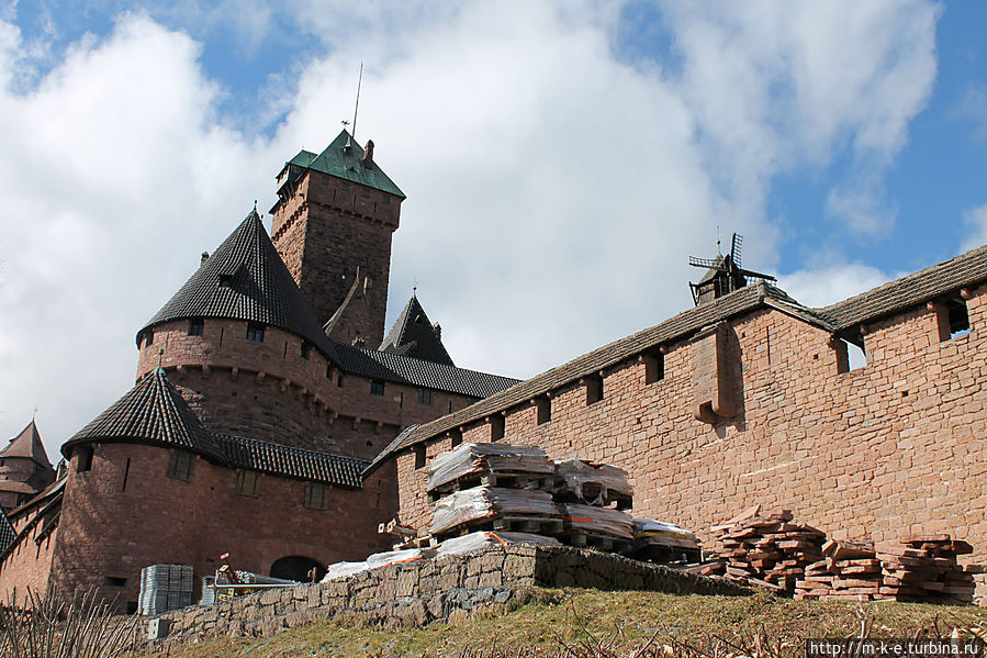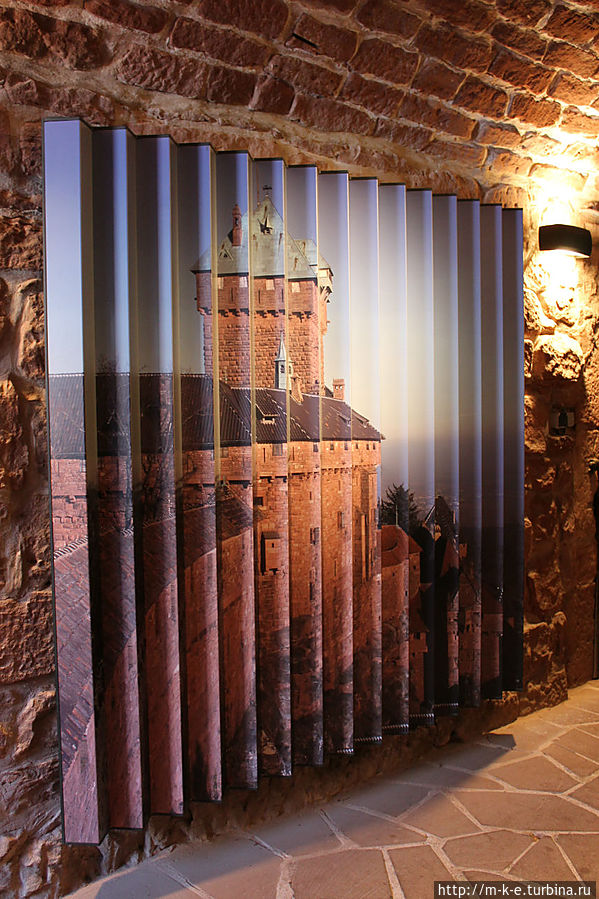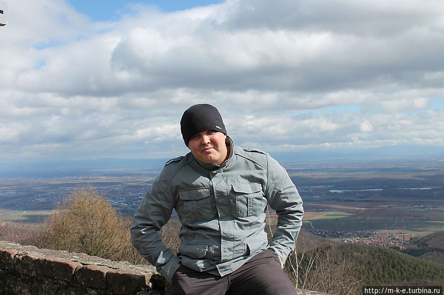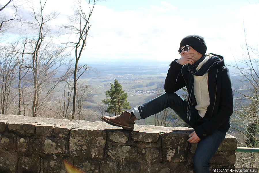 Для осмотра панорамы гор Вагезы нужно попасть в большой бастион. Путь сюда проходит через сад. В бастионе можно еще увидеть пушки и картину. Рассматривать ее нужно с двух сторон. С одной это будет замок в нынешнем виде, а со второй развалины 16 века. Спускаясь вниз проходим по тыловой части замка и выходим к стоянке. Здесь еще пара кадров на фоне пейзажа горной местности.