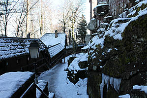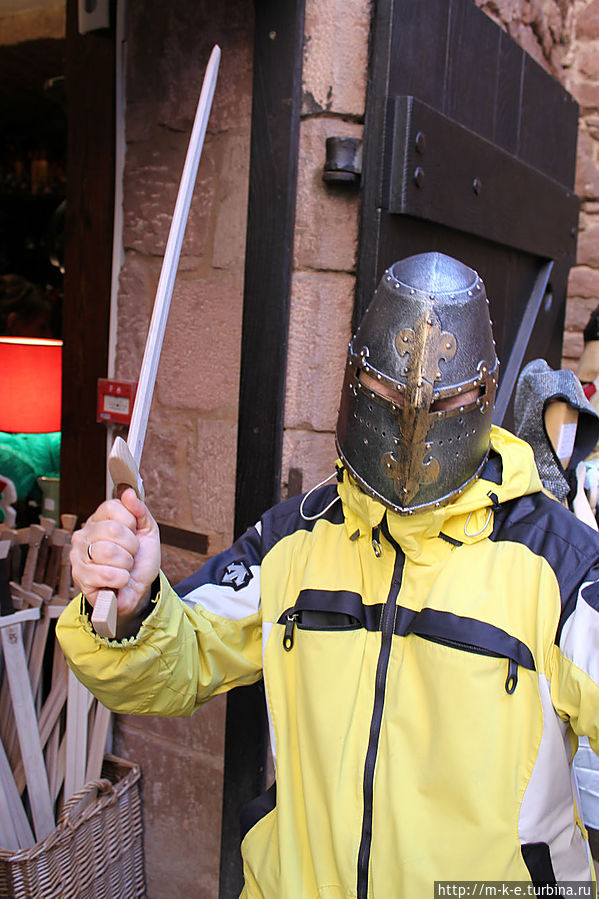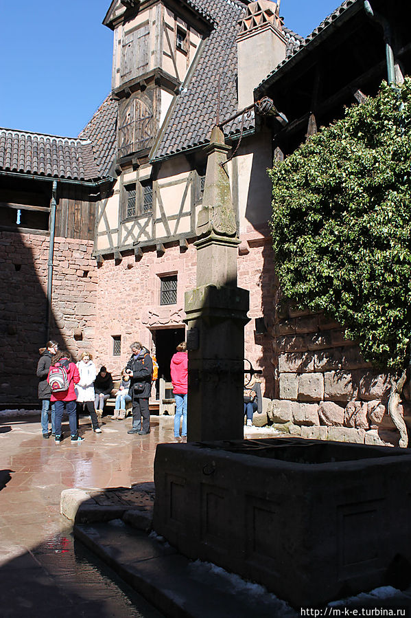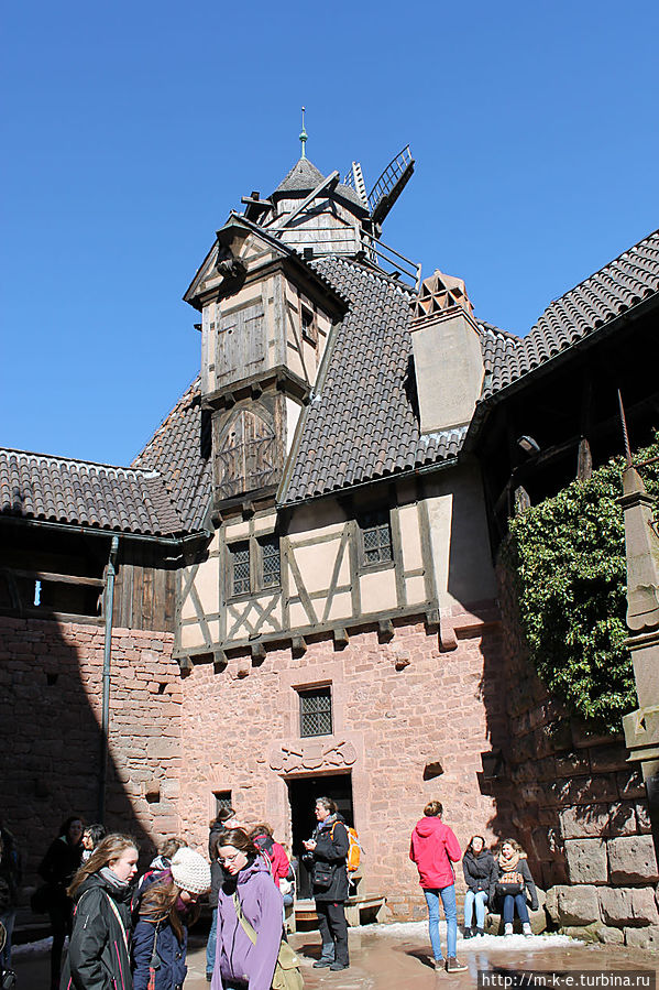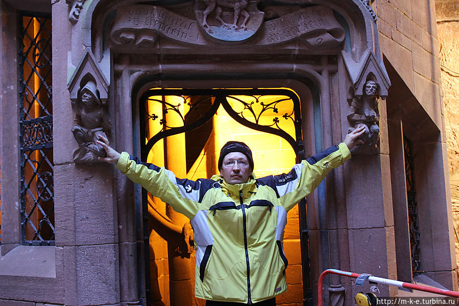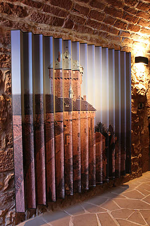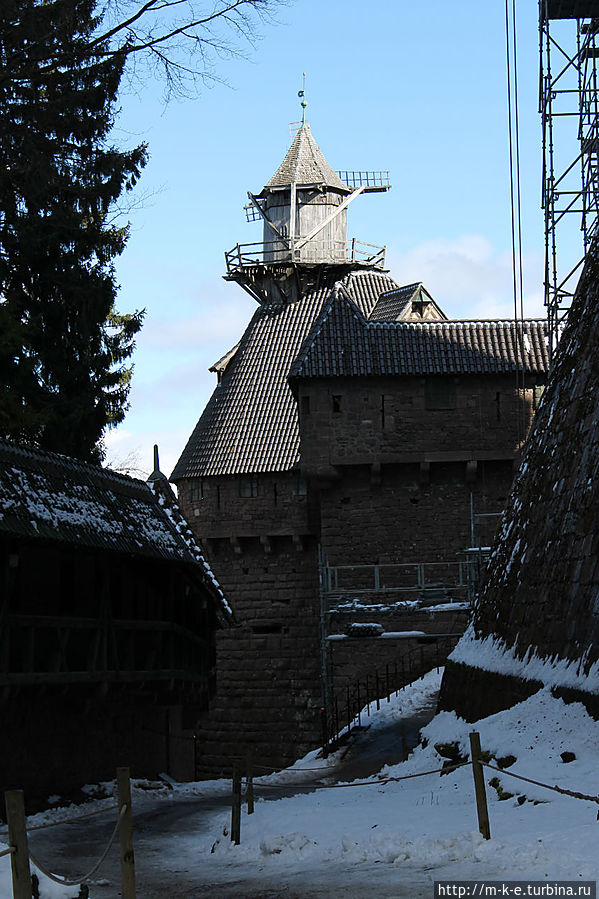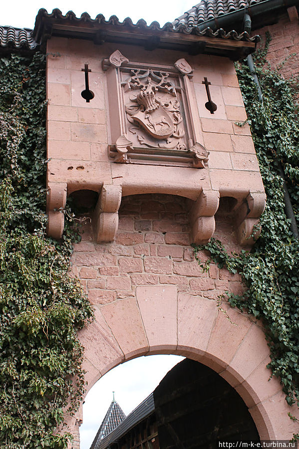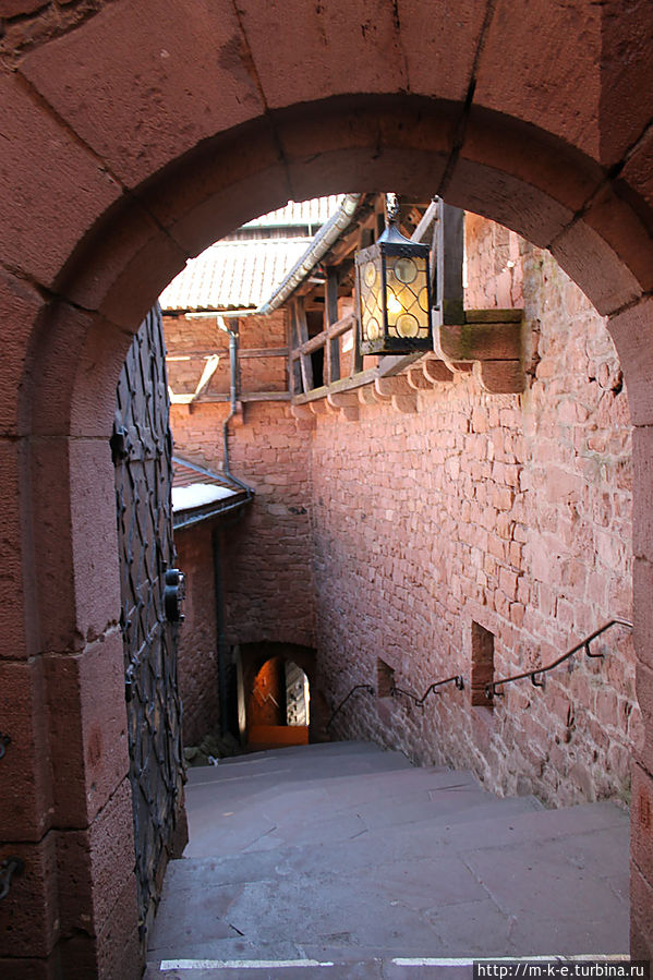 Для осмотра панорамы гор Вагезы нужно попасть в большой бастион. Путь сюда проходит через сад. В бастионе можно еще увидеть пушки и картину. Рассматривать ее нужно с двух сторон. С одной это будет замок в нынешнем виде, а со второй развалины 16 века. Спускаясь вниз проходим по тыловой части замка и выходим к стоянке. Здесь еще пара кадров на фоне пейзажа горной местности.