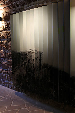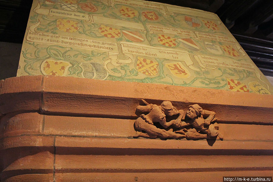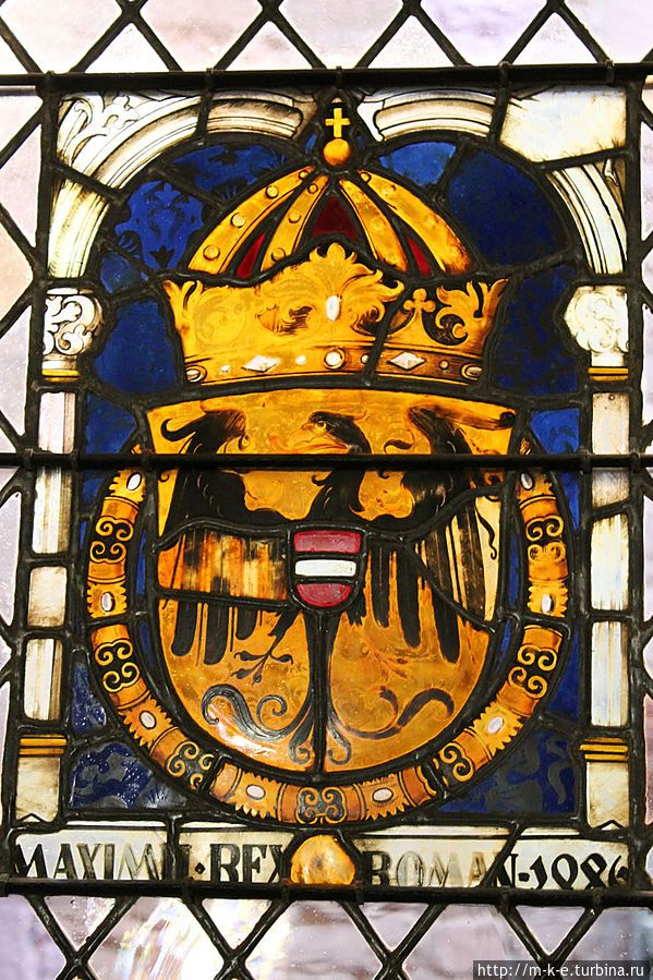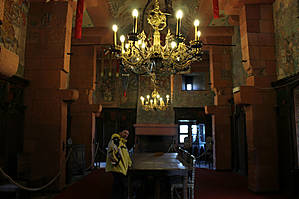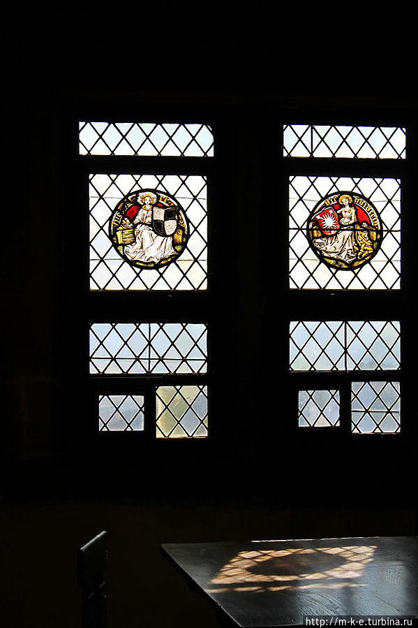 Дальше нас опускают вниз на второй этаж по винтовой лестнице и мы попадаем в часовню. В ней на камине обращают на себя внимания два молодца, занимающиеся армрестлингом. Пройдясь по комнатам нельзя не заметить красоту витражей. Любуясь ими, попадаем в оружейный зал. Где все как обычно — доспехи оружие и рога.