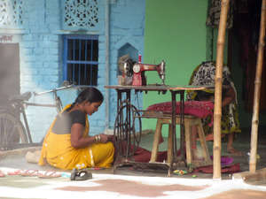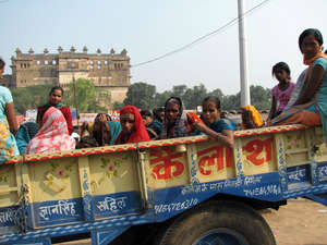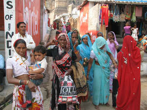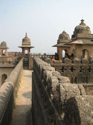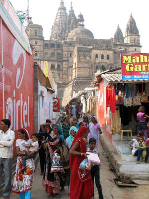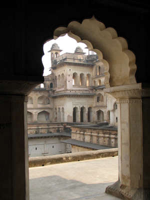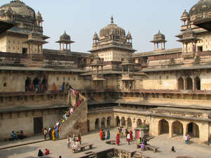 Население не превышает 10 тысяч. В городе сохранилось несколько дворцов и индуистских храмов 16-18 вв. Когда мы въехали в город, то поняли, что здесь какой-то праздник. Все улица были заполнены толпами людей. Женщины были одеты в сари и пенджаби всех цветов радуги. Все в основном ходили босиком, лодыжки и запястья были украшены множеством браслетов. Наш водитель протиснулся сквозь пеструю толпу к дворцу Джахангир-Махал. Припарковавшись, он показал, где мы можем купить билеты, сказал, чтобы после осмотра дворца не выбрасывали, так как по ним же можно было посетить еще и другие достопримечательности.Дворец оказался очень большим.