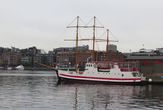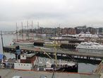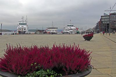 А здесь встречают пароходы, совсем не там, где поезда берег Пипервики представляет собой непрерывную парковку для частных яхт и небольших круизных/рейсовых кораблей. Так получилось, что наш хаотичный маршрут перемещений по Осло включил практически полностью берега залива, с непродолжительным выходом на Ратушную площадь и знакомством с громадным зданием Городского совета и скульптур, "украшающих" эту площадь...