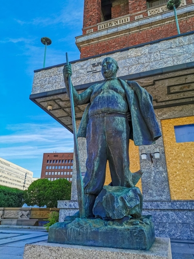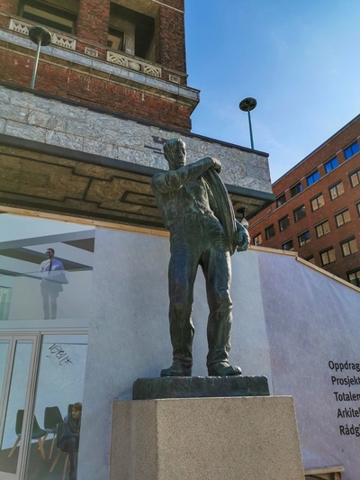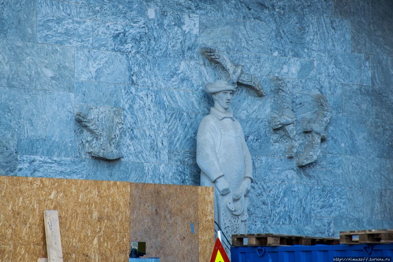 С крайней левой стороны восточного фасада можно заметить гранитную фигуру невеселого рыбака.Ее создал в 1941–48 годах норвежский скульптор Нильс Флакстад (Nils Flakstad) (1907-1979).