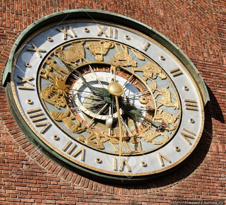 Часы показывают обычное время, звездное время, положение Солнца и Луны. Они имеют два циферблата: внешний (с римскими цифрами от I до XII) и внутренний (с арабскими, от 1 до 12 на одной половине и аналогично на второй), а также несколько стрелок. Указатель в виде обычной стрелки показывает текущее время на светлом внешнем циферблате. Второй указатель, со звездочкой, показывает на внутреннем темно-красном циферблате так называемое звездное время. Указатель в виде Солнца (золотого диска с лучиками) показывает движение светила на небе и текущий знак зодиака. Лунный указатель (наполовину черная, наполовину серебристая сфера) показывает фазу Луны (скажем, в полнолуние она серебристая, а в новолуние — абсолютно черная). Указатель в виде дракона показывает затмения (в этом случае он закрывает солнечный и лунный указатели).