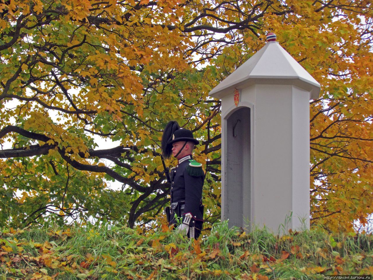 • 22. Справа от казарм на фоне замка видим ещё одно здание — это гауптвахта 1724 года постройки. Перед ним стоит часовой, обозначая собой важность объекта, перед которым его поставили. Правда, в чём его важность, как-то не очень понятно, но норвежскому министерству обороны виднее. У часового трудная работа. Вон, пожалуйста, набежали китайцы и норовят встать рядом, чтобы получить офигенный снимок почти в обнимку с экзотическим норвежским часовым, каких в Китае днём с огнём не сыщешь.