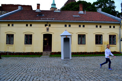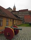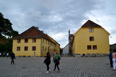 Норвежцы чётко делят строения на две части: Внешние укрепления или крепость и цитадель или замок. Вот к нему и направимся мимо желтых зданий, которые использовались ещё датским гарнизоном. Его видно издалека. По мощёным дорожкам и лесенкам поднимаемся вверх и вот она цитадель.