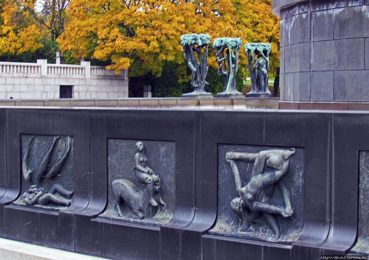 • 25. Снова настроившись на философский лад, скажем, что это чаша жизни, бесконечно утекающей и бесконечно возобновляемой. Весь парк Вигеланна посвящён одной теме — человеческой жизни, её бесконечному круговороту от рождения до смерти. По краю бассейна расположено множество барельефов всё на ту же нескончаемую тему.