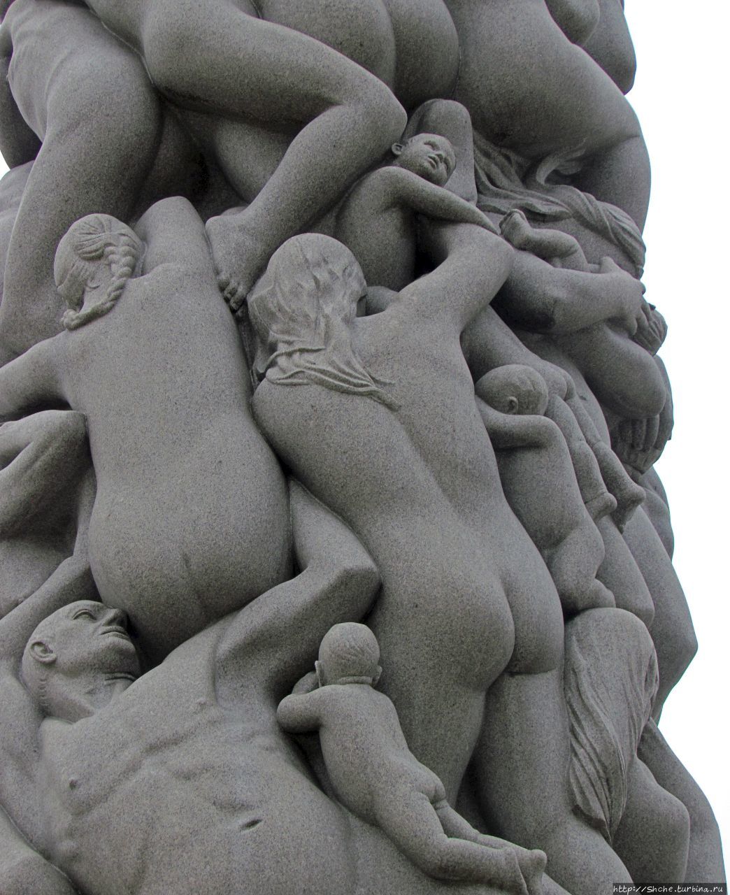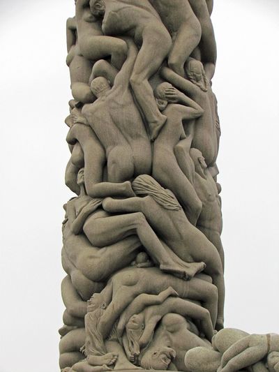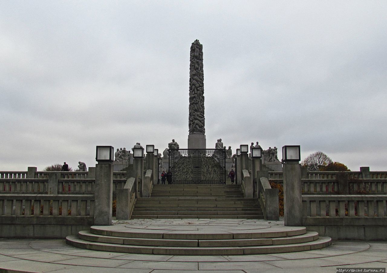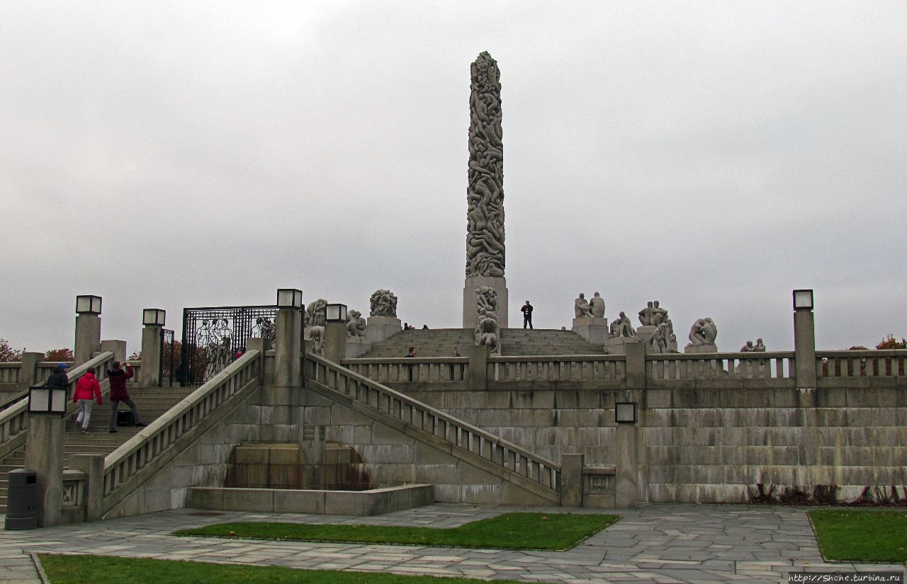 • 31. Группа Монолита представляет собой центральную колонну высотой 14 метров, которая и есть Монолит (Monolitten), и ряды радиально расположенных скульптур, спускающихся ступенями от колонны. Этих скульптур 36. Колонна словно бы слеплена из множества человеческих фигур.