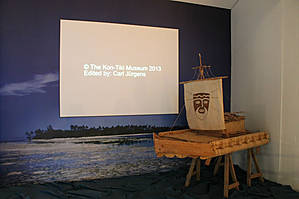 Во время осмотра музея не хватало подробной информации о его путешествиях. В одном из залов увидели, что по мотивам путешествия этого человека снят одноименный фильм "Кон-Тики". Приехав домой, мы не удержались и сходили на этот фильм. Оказывается в прокате он с 18 апреля и если бы не посещение музея он остался бы для нас незамеченным.После фильма все экспонаты музея и история жизни путешественника была разложена по полочкам и многие экспонаты музея заняли на этих полочках соответствующие места. Началось все в 1914 году в городе Лаврик, что в Норвегии. С детских лет молодой человек рос любознательным человеком, Занимаясь изучением старинных летописей и рисунков испанских конкистадоров с изображением плотов инков, а также местные легенды и археологические свидетельства, он предположил, что между Южной Америкой и Полинезией могли быть контакты. Данное предположение шло вразрез с научной теорией, присутствующей на тот момент. Чтобы доказать обратное в 1947 вместе с пятью отважными единомышленниками он создал по чертежам индейцев Перу плот из бревен базальтового дерева и назвал его Кон-Тики. Название плота это имя легендарного героя, бога и вождя полинезийских сказаний. Согласно им Кон-Тики приплыл с запада в Полинезию и основал первые полинезийские поселения.