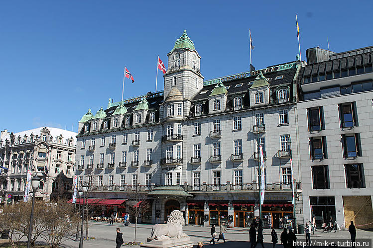 Если встать спиной к парламенту , то справа увидим симпатичное здание Гранд отеля. Это самая шикарная гостиница города, где каждый год останавливаются лауреаты Нобелевской премии. На первом этаже отеля в Гранд Кафе ежегодно 10 декабря после вручения Нобелевской премии проходит торжественный банкет. В любое время здесь в кафе можно заказать себе любой из нобелевских ужинов последних 10 лет. На одном из столиков у окна можно увидеть цилиндр, принадлежащий завсегдатаю кафе драматургу Хенрику Ибсену. Это место ранее было всегда зарезервировано за ним.