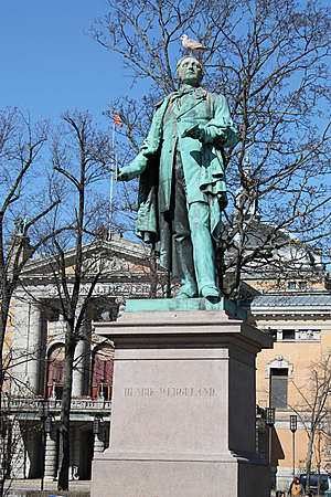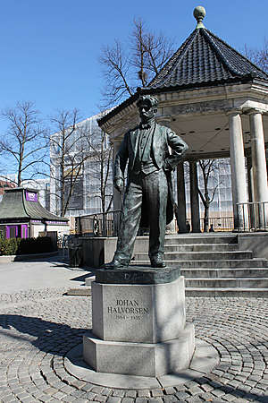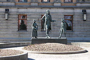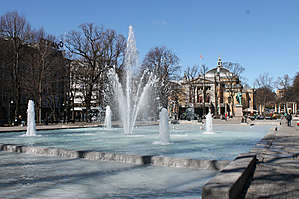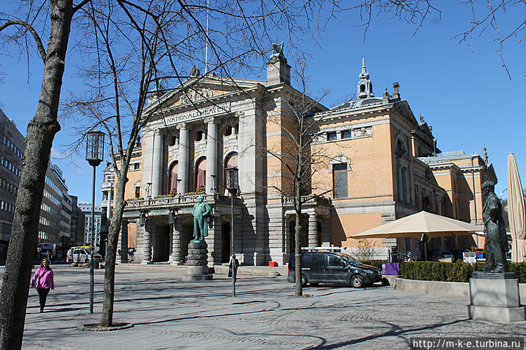 А напротив парламента стоит здание национального театра,открытого в 1899 году. Перед зданием театра ближе к фонтану стоит памятник актеру Пер Аабелю — ведущему актеру в роли короля Людовика. Кроме этого рядом еще несколько памятников людям искусства.