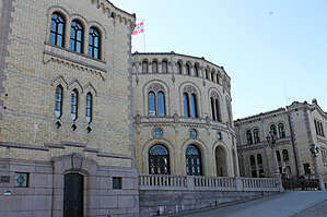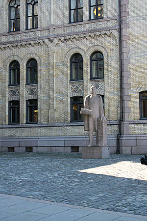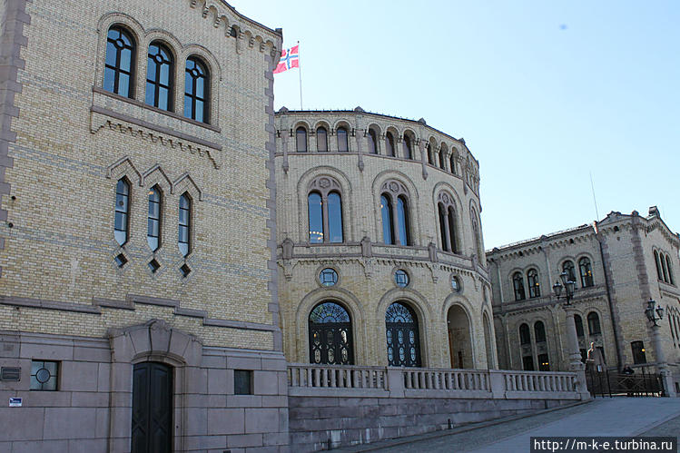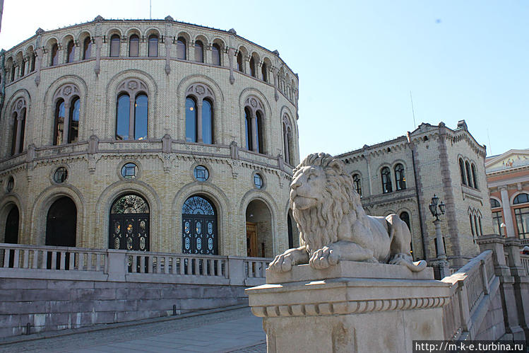 Название свое фонтан получил, наверное из-за струй воды в виде гвоздиков. Зимой фонтан превращается в каток. Фонтан окружает большое количество скульптур, на которые стоит обратить внимание. Здесь дети играют у фонтана, находясь в позах кидающих камушки, обнаженный мужчина поднял руки вверх, как будто сдается . С другой стороны фонтана незамысловатая фигура белого цвета.Но конечно площадь славится не этими скульптурами, зданиями ее окружающими. Начну со здания с полукруглым фасадом, чем то напоминающим замок. Это Стортинг — норвежский парламент или в переводе Большой Совет. Перед ним памятник Йохану Свердрупу -политическому деятелю, первому премьер-министру страны. С двух сторон на премьер-министра смотрят симпатичные львы, которые по ночам по легенде убегают в город и поедают незадачливых туристов. Сам совет начал действовать раньше , чем было построено это здание, а именно в 1814 году, когда по окончании наполеоновских войн Норвегию предали в управление Швеции (1814), последний датский правитель – принц Кристиан Фредерик – даровал народу Конституцию, которая до сих пор является основным законом страны. .