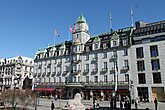 Если встать спиной к парламенту , то справа увидим симпатичное здание Гранд отеля. Это самая шикарная гостиница города, где каждый год останавливаются лауреаты Нобелевской премии. На первом этаже отеля в Гранд Кафе ежегодно 10 декабря после вручения Нобелевской премии проходит торжественный банкет. В любое время здесь в кафе можно заказать себе любой из нобелевских ужинов последних 10 лет. На одном из столиков у окна можно увидеть цилиндр, принадлежащий завсегдатаю кафе драматургу Хенрику Ибсену. Это место ранее было всегда зарезервировано за ним.
