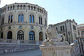Название свое фонтан получил, наверное из-за струй воды в виде гвоздиков. Зимой фонтан превращается в каток. Фонтан окружает большое количество скульптур, на которые стоит обратить внимание. Здесь дети играют у фонтана, находясь в позах кидающих камушки, обнаженный мужчина поднял руки вверх, как будто сдается . С другой стороны фонтана незамысловатая фигура белого цвета.Но конечно площадь славится не этими скульптурами, зданиями ее окружающими. Начну со здания с полукруглым фасадом, чем то напоминающим замок. Это Стортинг — норвежский парламент или в переводе Большой Совет. Перед ним памятник Йохану Свердрупу -политическому деятелю, первому премьер-министру страны. С двух сторон на премьер-министра смотрят симпатичные львы, которые по ночам по легенде убегают в город и поедают незадачливых туристов. Сам совет начал действовать раньше , чем было построено это здание, а именно в 1814 году, когда по окончании наполеоновских войн Норвегию предали в управление Швеции (1814), последний датский правитель – принц Кристиан Фредерик – даровал народу Конституцию, которая до сих пор является основным законом страны. .