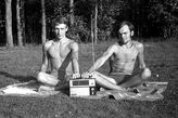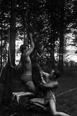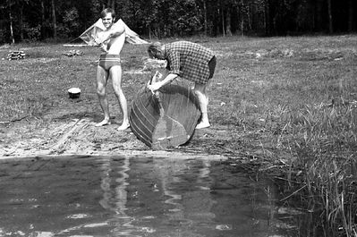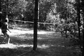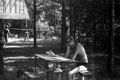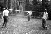 У нас разворачивались нешуточные бадминтонные баталии, для чего мы соорудили по образцу предыдущего года бадминтонную площадку. На фотоснимке видно, как Юра с Сашей устраняют мешающие ветки над площадкой.