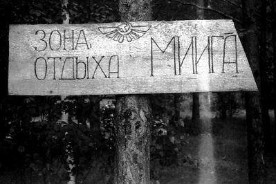 В виде шутки я выжег на доске, и мы прикрепили к дереву вот такое объявление, подразумевая, что здесь отдыхают студенты МИИГА. Не все эту шутку понимали, приходилось разъяснять.
