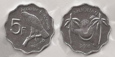 Остров Мвали. Деньги поры небольшого периода независимости, так и остров Анжуан.Первая попытка была осуществлена в 1997 году, практически одновременно с островом Мвали. Сначала власти острова объявили его независимым, а затем планировали вернуться в состав Франции, но реальной поддержки со стороны французов не получили. Хотя администрация Майотты негласно поддерживала сепаратистов, а когда власти Комор начали экономичекую блокаду острова, то часть жителей Анжуана переселилось на Майотту.