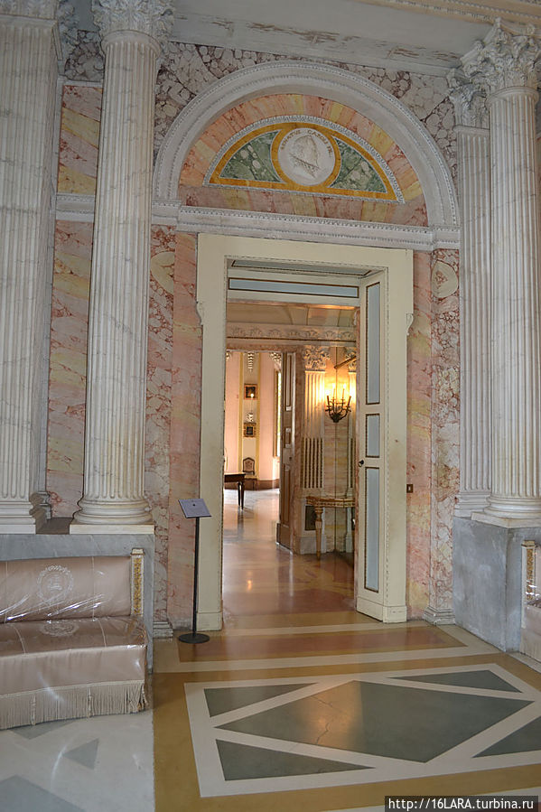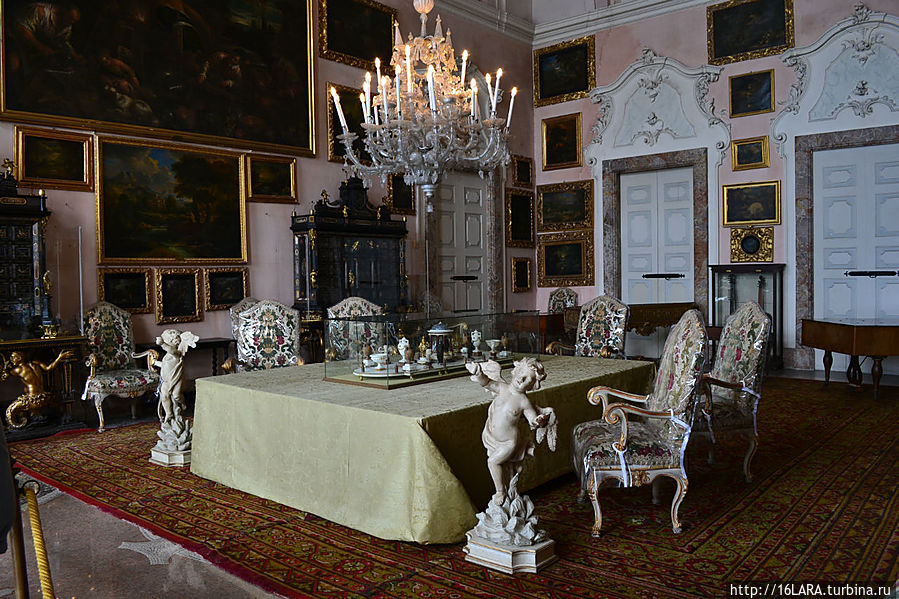 Внутреннее убранство выполнено в стиле барокко, залы украшены картинами, скульптурами, старинной мебелью, люстрами из муранского стекла.