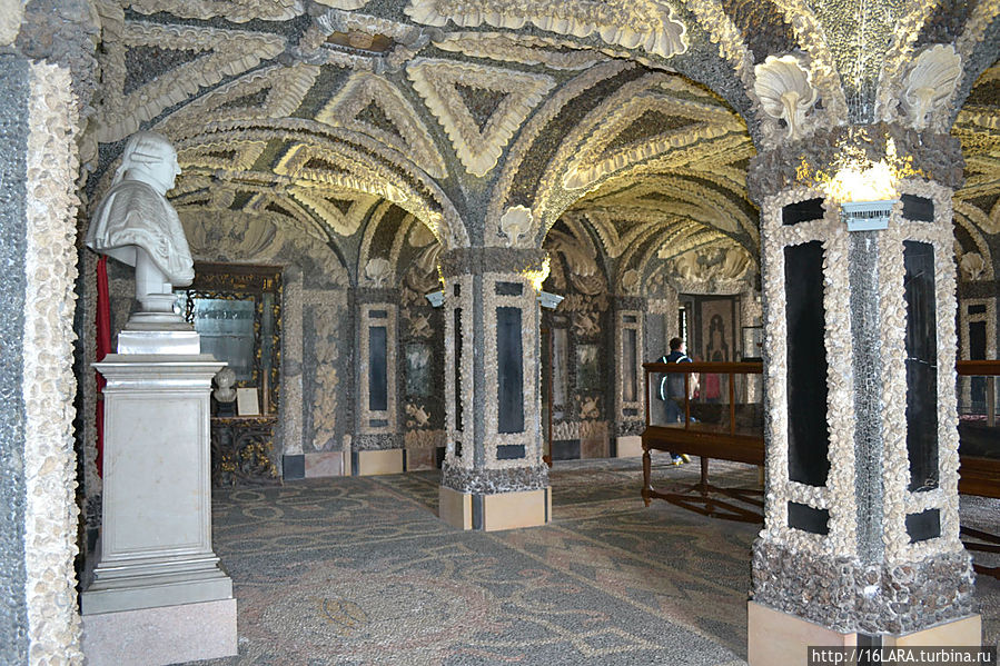 В полуподвальном этаже дворца расположены 6 гротов в которых всегда прохладно. Отделка гротов из мелких камней и ракушек.