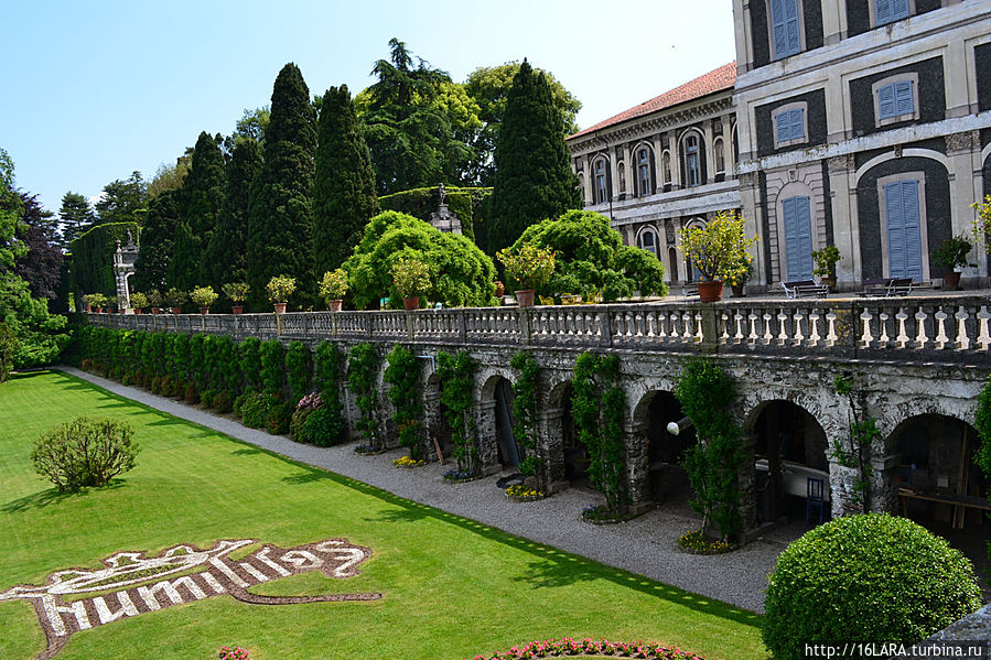 Платформа с 10 террасами, украшенная нишами, фонтанами, статуями нимф формирует уникальный Висячий сад. В саду растут экзотические растения. На вершине платформы, на высоте 34 метра, возвышается единорог, символ семьи Борромео.