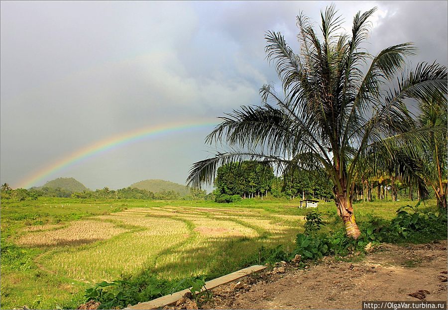 Уже дошли до рисовых полей, когда первые капли упали с неба. Всё-таки не зря тучки носились над холмами. И на нас обрушился такой ливень, что пришлось срочно искать убежище. По счастью на краю дороги увидели хибарку с травяной крышей. Вот сидишь в такой хижинке, на которую ведрами льется вода, а тебе ни по чем. Только ничего не видно за стеной дождя, словно смыл он холмы, как съедают конфеты.