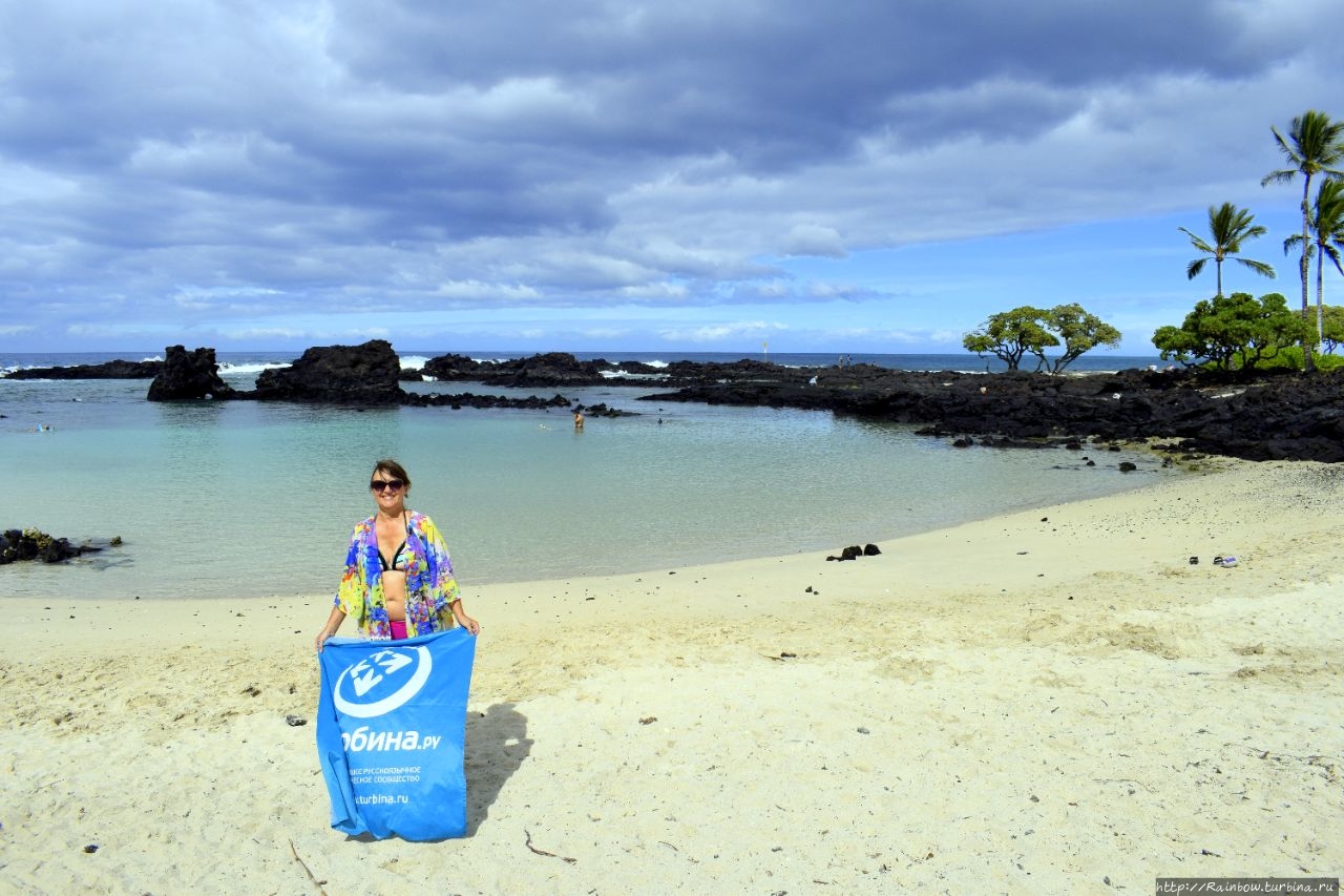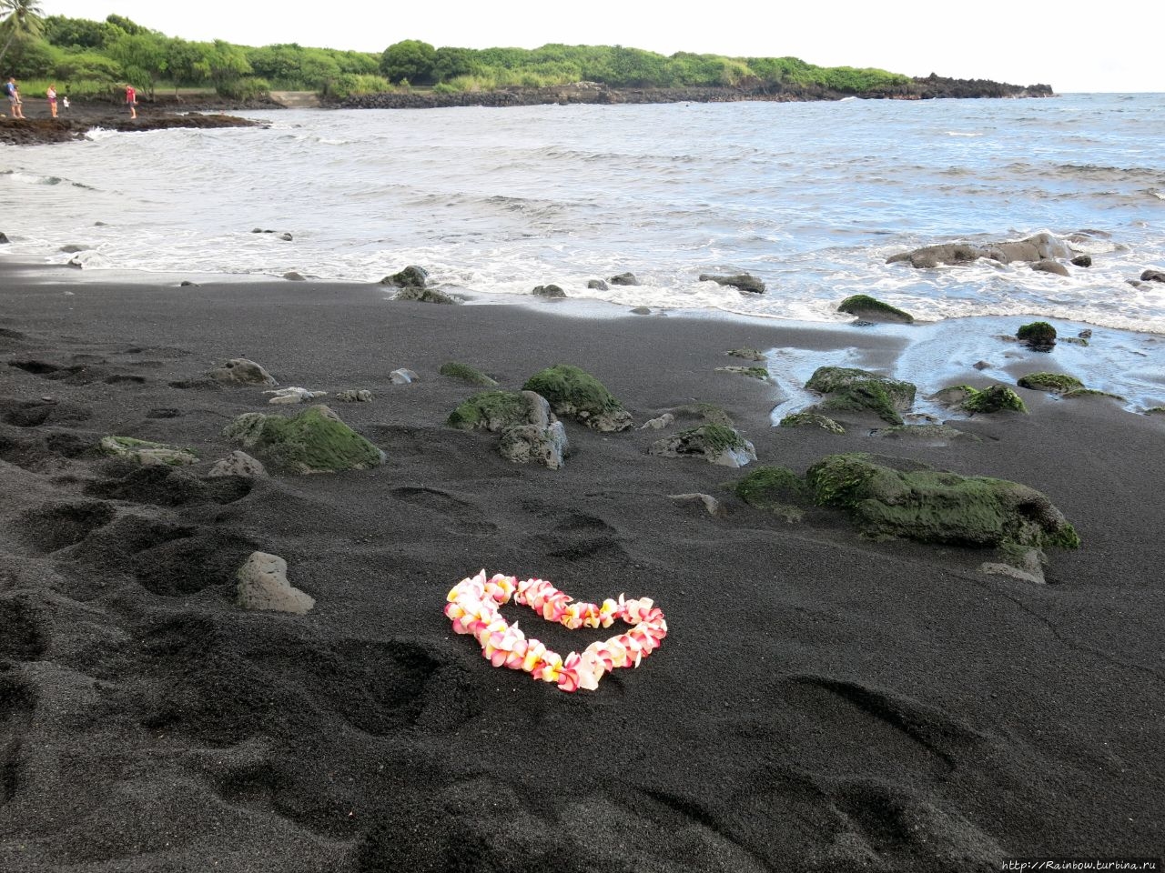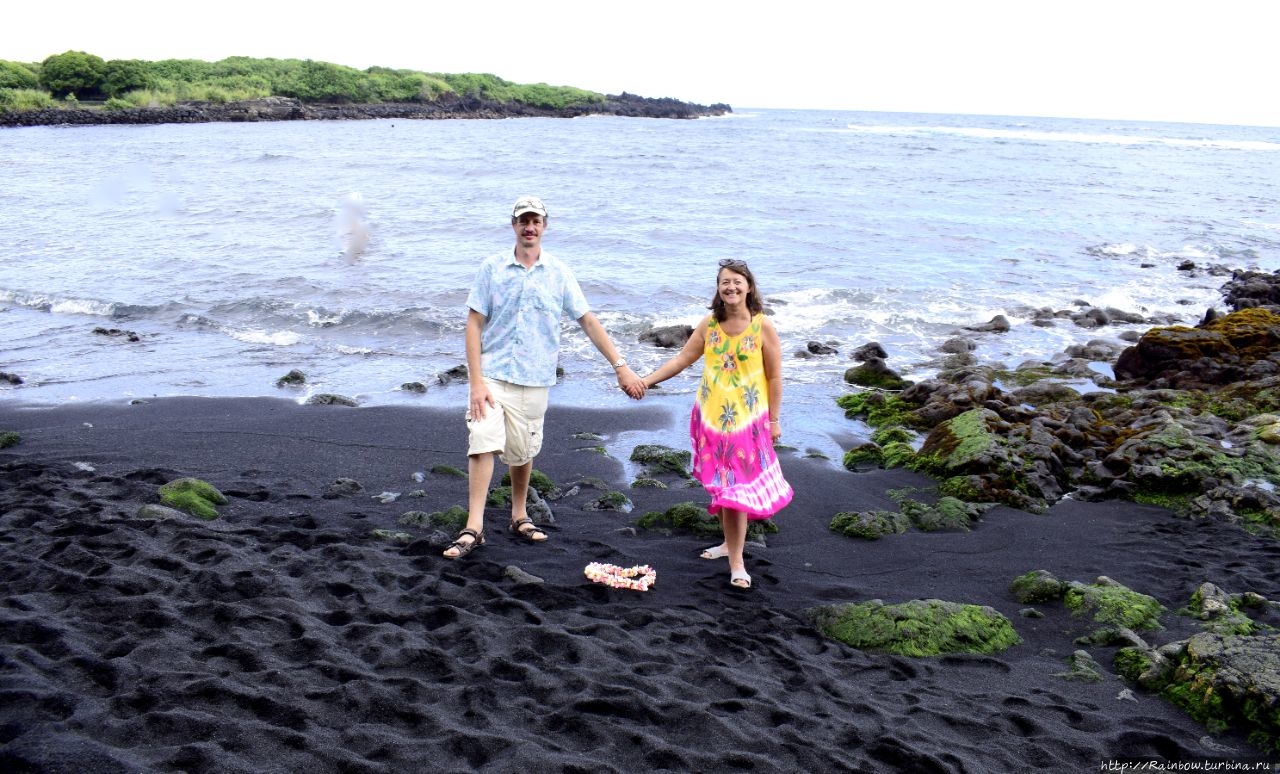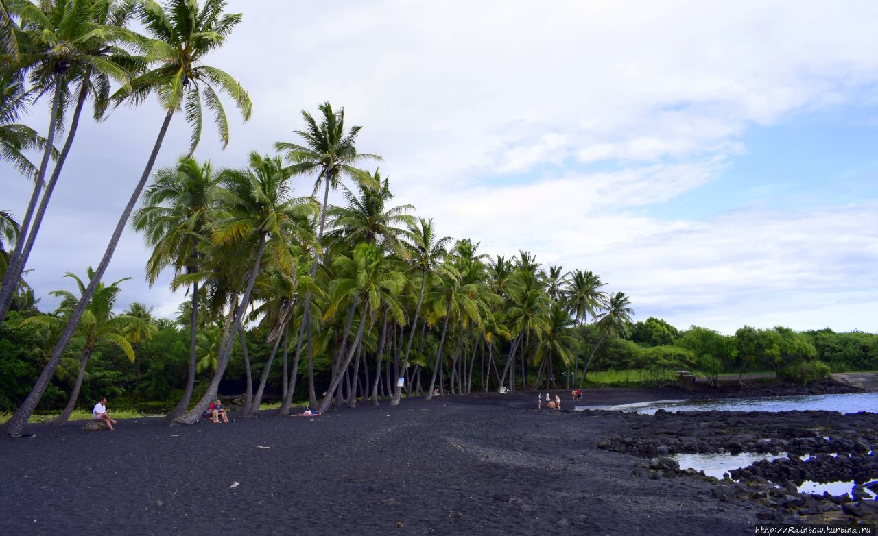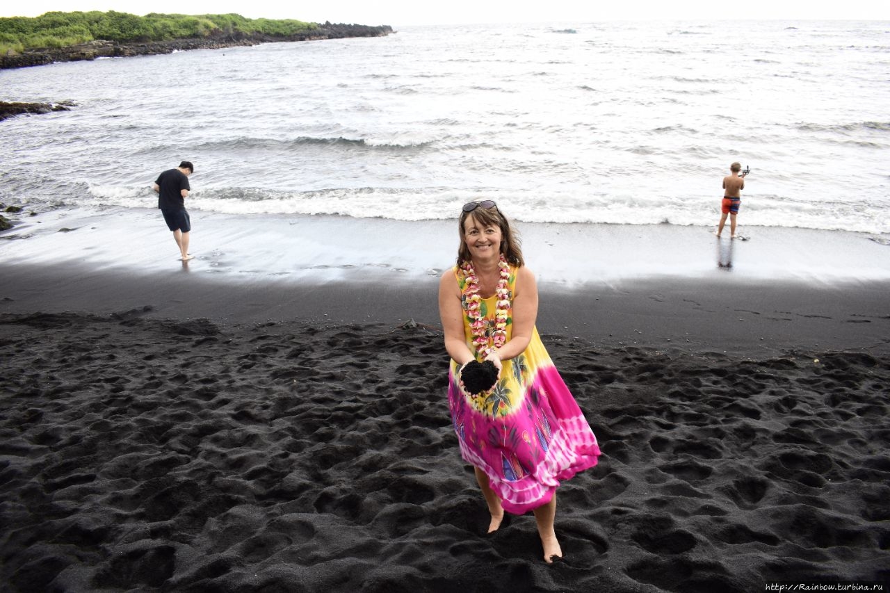Пляжей с черным песком на Гавайях несколько. Но подавляющее их большинство не пригодно для купания из-за большого количества скал и камней с острыми краями. Поэтому пляж Пуналуу пользуется такой популярностью у туристов. Но и здесь плавать не очень рекомендуется из-за скал в океане. К тому же вода здесь холоднее, чем на других пляжах острова из-за пресных родников, бьющих на дне. А в тот день не светило солнце и мы не купались. Мы получали удовольствие от знакомства с такой достопримечательностью. Для купания здесь есть другие места.