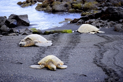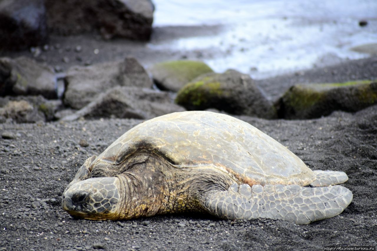 Остается только рассматривать их на расстоянии, но объективом их приблизить никто не запрещает. Честно сказать, они очень крупные, но это не удивительно, на Гавайях вообще крупные черепахи и встретиться с ними при купании в океане не так уж и сложно. Но вот так, рассматривать их спокойно на берегу — это редкость. И даже хорошо, что именно на этом пляже, потому что черный песок очень контрастирует с цветом их тела.