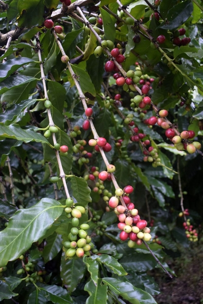 И кусты кофе, незрелые плоды которых напоминают ягоды.