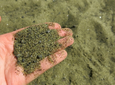 Почему же пляж зеленый? По той же причине, почему черный предыдущий пляж. В результате вулканических процессов на поверхность поднялись слои, богатые хризолитом, еще известный как оливин. А оливин имеет зеленый, вернее даже оливковый цвет. Этот камень используется в ювелирной промышленности. А здесь зеленые кристаллы оливина смешиваются с черным лавовым и белым коралловым песком, поэтому он неоднородный. Давайте рассмотрим поближе это удивительное зрелище.