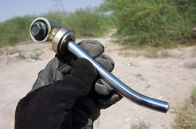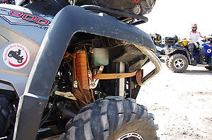 Похоже, температура сделала свое черное дело. При такой жаре, при которой нам приходится ехать, вообще непонятно, как раскаленные аморты справляются со своей задачей. По-крайней мере, до деталей ходовой части квадроцикла невозможно дотронуться даже в перчатке. Итог печален: в руках вместо одной стойки, три компонента – пружина, согнутый шток и «банка» с вытекшим маслом.