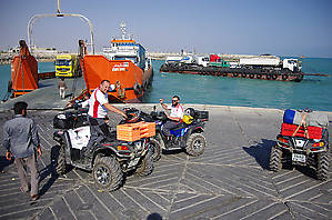 Попасть на остров-курорт можно только на пароме. Причем, перед погрузкой надо пройти таможню, заполнив уйму документов на фарси. На наше счастье, таможенники отнеслись к нам очень по-дружески, не только оформив все бумаги за нас, но полностью сопроводили команду до загрузки на паром. Иностранных туристов здесь бывает не много. Русские, да еще на квадроциклах, вообще, похоже, появились впервые.