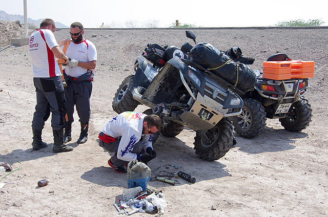 Почему-то всегда после отдыха в пятизвездных отелях с нами обязательно случается что-нибудь отвратительное. Как будто это плата за вчерашний «расслабон». На выезде из Бандер-Аббаса, Миша прыгнул через «лежачий полицейский» и сломал амортизатор. Почему это произошло, объяснить сложно, поскольку лежачих полицейских к этому моменту мы перепрыгнули больше тысячи и вообще воспринимали это, как забаву. Выпуклость в асфальте, которая задумана для того, чтобы все снижали перед ней скорость, для нас не является сколько-нибудь сложным препятствием и даже имеет форму, чем-то напоминающую кроссовый трамплин. Поэтому мы, наоборот, обычно прибавляем скорость, чтобы поднять себе настроение и повеселить горожан. Отрыв всех четырех колес и полет в тридцати сантиметрах от асфальта вызывает неподдельный восторг даже у блюстителей порядка.