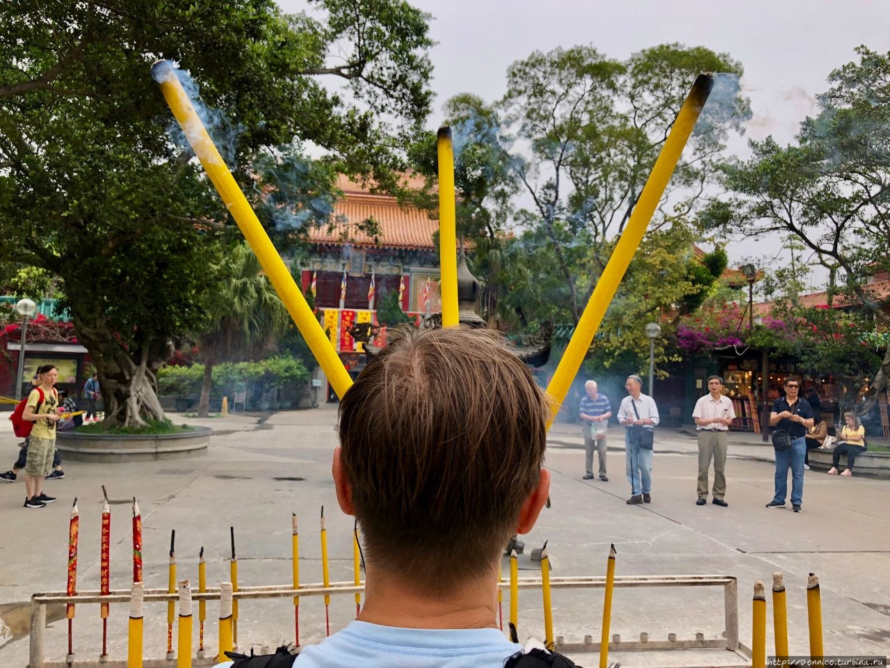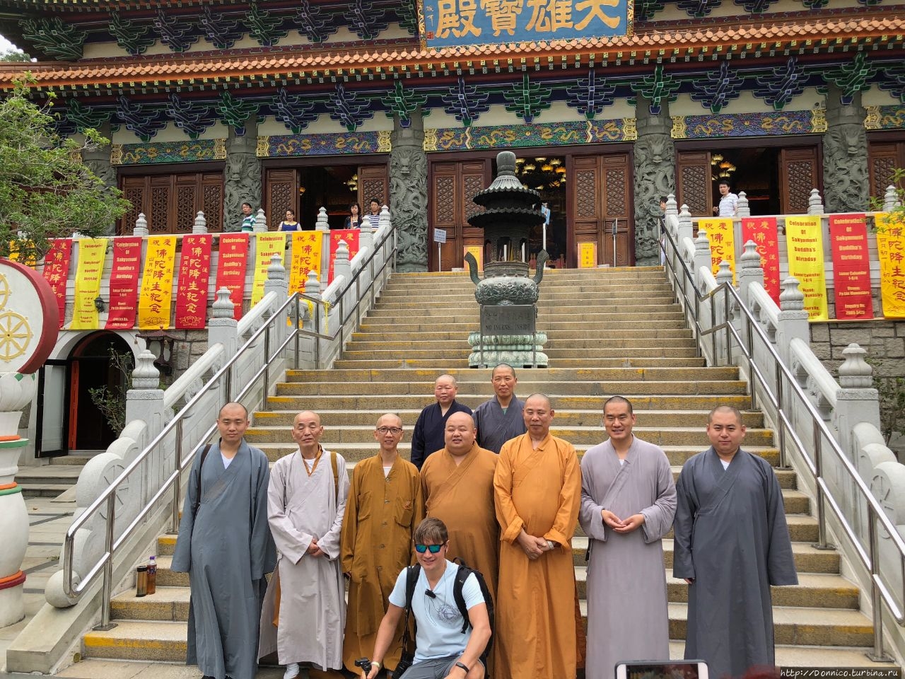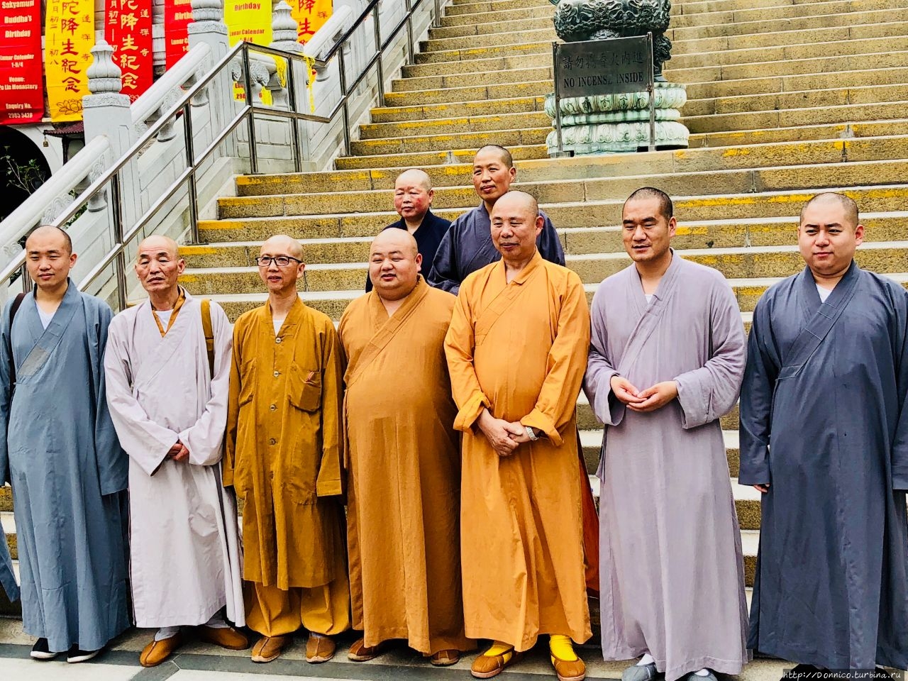 Дело было так. Вначале на выходе из холла 10,000 будд мы конечно Хотея не заметили. На ступенях монастыря стояла большая группа монахов в разного цвета одеяниях и они фотографировались.