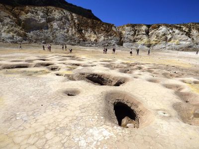Вулкан считается активным. Периодически он что-то "выдаёт" (например, 12 лет назад был выброс большого количества газа, т.е. вулкан "дышал"). Конечно, хотелось бы ощутить, как земля трясётся под ногами, а в "дырках" булькает раскалённая лава :)... На самом деле ничего такого нет, однако в отверстиях происходят какие-то процессы: что-то кипит, идёт пар, появляется пепел и пахнет серой.