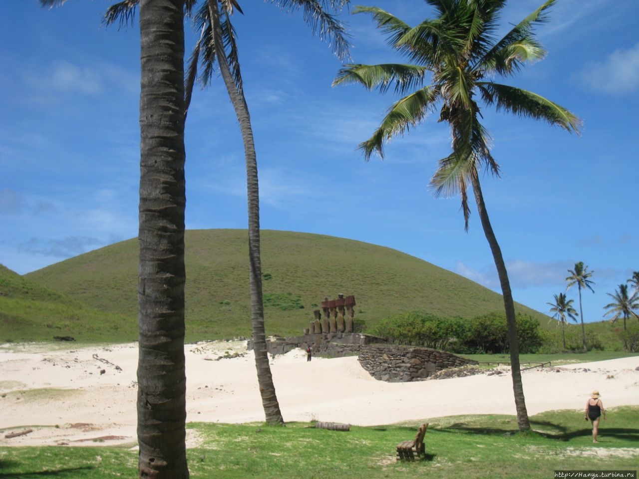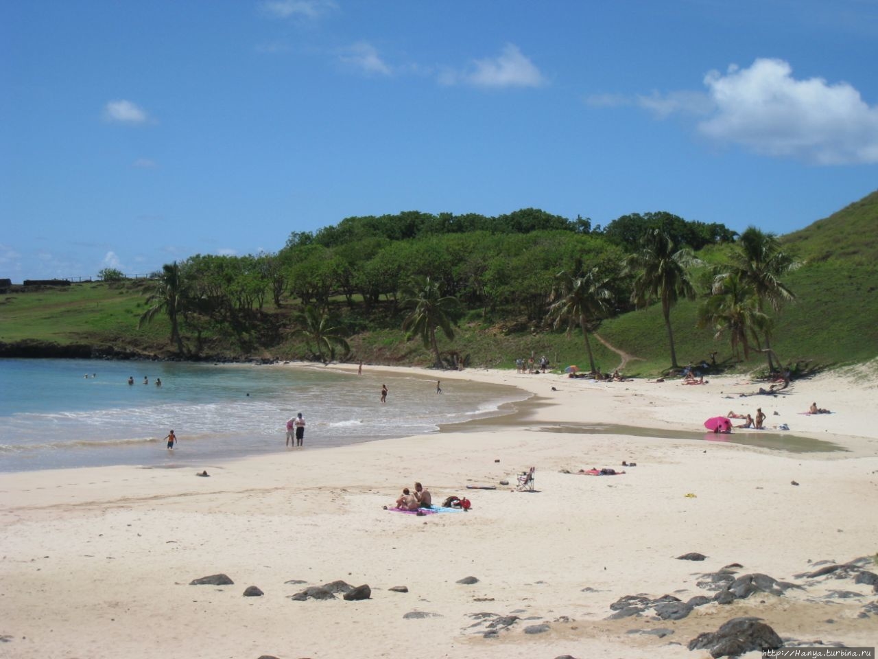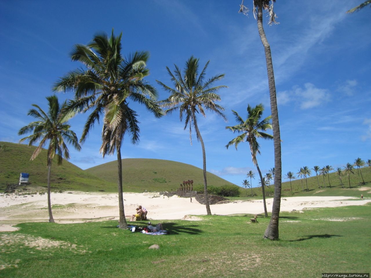 Аху Те Пито Кура и аномальный пуп Земли. Ч.70), потому что «настал момент такой» – «делу время, а потехе – час…». Вскоре мы достигаем Anakena, которая является главным пляжем на острове Пасхи, представляя собой типичную картину, какую мы рисуем себе, думая о райском пляже Баунти. Его белый, мелкий коралловый песок, кристально чистое бирюзовое море, спокойные волны и кокосовые пальмы (привезенные с Таити несколько десятилетий назад) делают его идеальным местом для отдыха.Гид еще в машине успевает сообщить нам, что пляж Anakena приглашает искупаться в любое время года, так как температура воды здесь держится в среднем на приятных 20oC, с небольшими вариациями летом и зимой. Anakena, которую мы увидели, по сравнению с другими мировыми курортами по-прежнему довольно нетронутый пляж, с небольшим количеством отдыхающих, которых еще меньше в первой половине дня. Организованные туры обычно прибывают сюда во второй половине дня, а вот в низкий сезон, говорит гид, здесь даже можно насладиться в одиночку этим маленьким, отдаленным и красивым раем на земле. Однако если бы это место только ограничивалось вожделенным пляжем, но нет, это не просто пляж-мечта и идиллическое место отдыха. Это место считается колыбелью истории и культуры острова Пасхи. Именно здесь первый король острова, Арики Хоту Матуа, приземлился со своими людьми и основал первый населенный центр, который потом породил культуру Рапа Нуи.