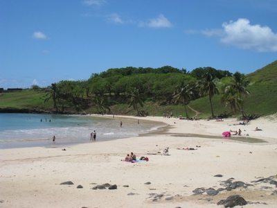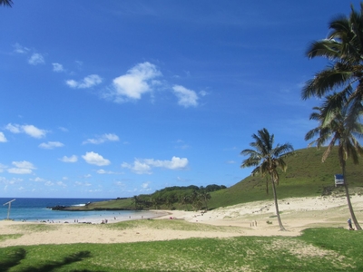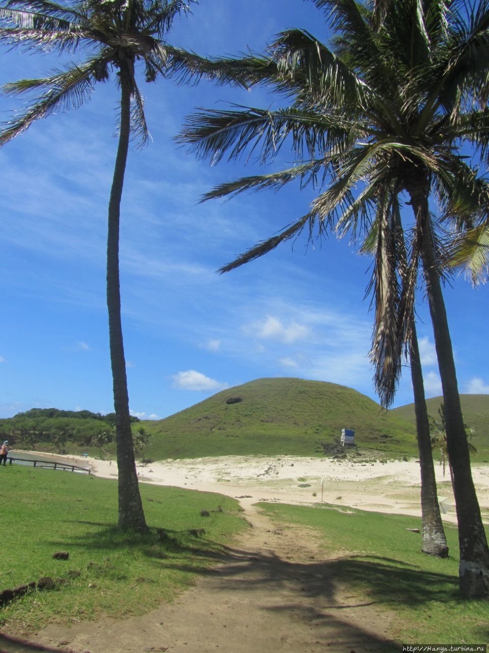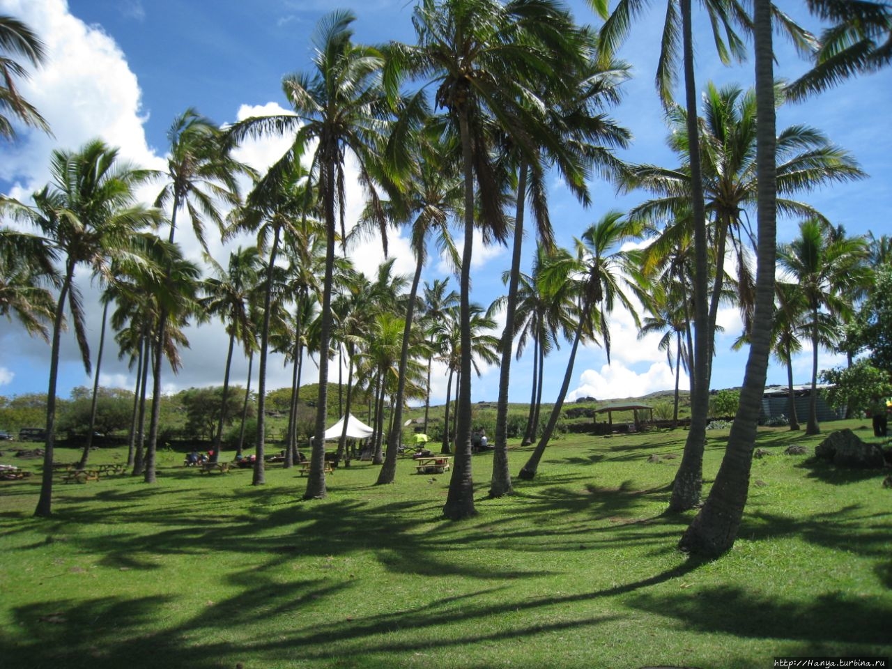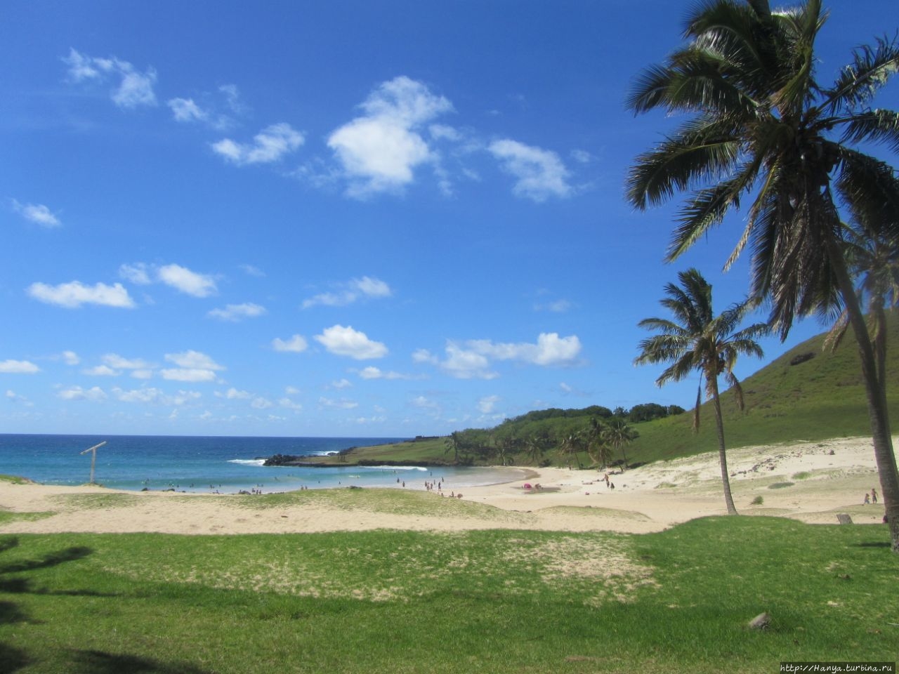 Аху Те Пито Кура и аномальный пуп Земли. Ч.70), потому что «настал момент такой» – «делу время, а потехе – час…». Вскоре мы достигаем Anakena, которая является главным пляжем на острове Пасхи, представляя собой типичную картину, какую мы рисуем себе, думая о райском пляже Баунти. Его белый, мелкий коралловый песок, кристально чистое бирюзовое море, спокойные волны и кокосовые пальмы (привезенные с Таити несколько десятилетий назад) делают его идеальным местом для отдыха.Гид еще в машине успевает сообщить нам, что пляж Anakena приглашает искупаться в любое время года, так как температура воды здесь держится в среднем на приятных 20oC, с небольшими вариациями летом и зимой. Anakena, которую мы увидели, по сравнению с другими мировыми курортами по-прежнему довольно нетронутый пляж, с небольшим количеством отдыхающих, которых еще меньше в первой половине дня. Организованные туры обычно прибывают сюда во второй половине дня, а вот в низкий сезон, говорит гид, здесь даже можно насладиться в одиночку этим маленьким, отдаленным и красивым раем на земле. Однако если бы это место только ограничивалось вожделенным пляжем, но нет, это не просто пляж-мечта и идиллическое место отдыха. Это место считается колыбелью истории и культуры острова Пасхи. Именно здесь первый король острова, Арики Хоту Матуа, приземлился со своими людьми и основал первый населенный центр, который потом породил культуру Рапа Нуи.