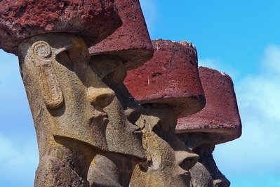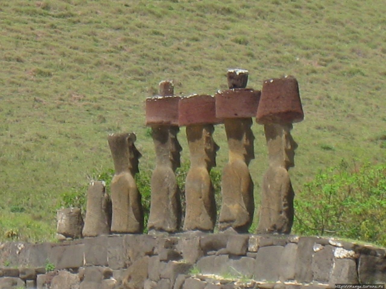 Что касается самой платформы, то ее длина составляет 60 метров, а ширина 12 метров. На возвышении стоят семь статуй, первые четыре слева практически остались нетронутыми и увенчаны pukao, головным убором или шиньоном (вот оно, верное слово!) из красной вулканической скории из карьера Пуна Пау. Эти моаи, наряду с единственным в Tongariki и Аху Ко Те Рику в Тахае, являются единственными на острове, у которых голову венчает этот головной убор. Пятый моаи хоть и очень хорошо сохранился, но у него не хватает pukao, у шестого напрочь отсутствует голова, а седьмой, демонстрирует только половину туловища.