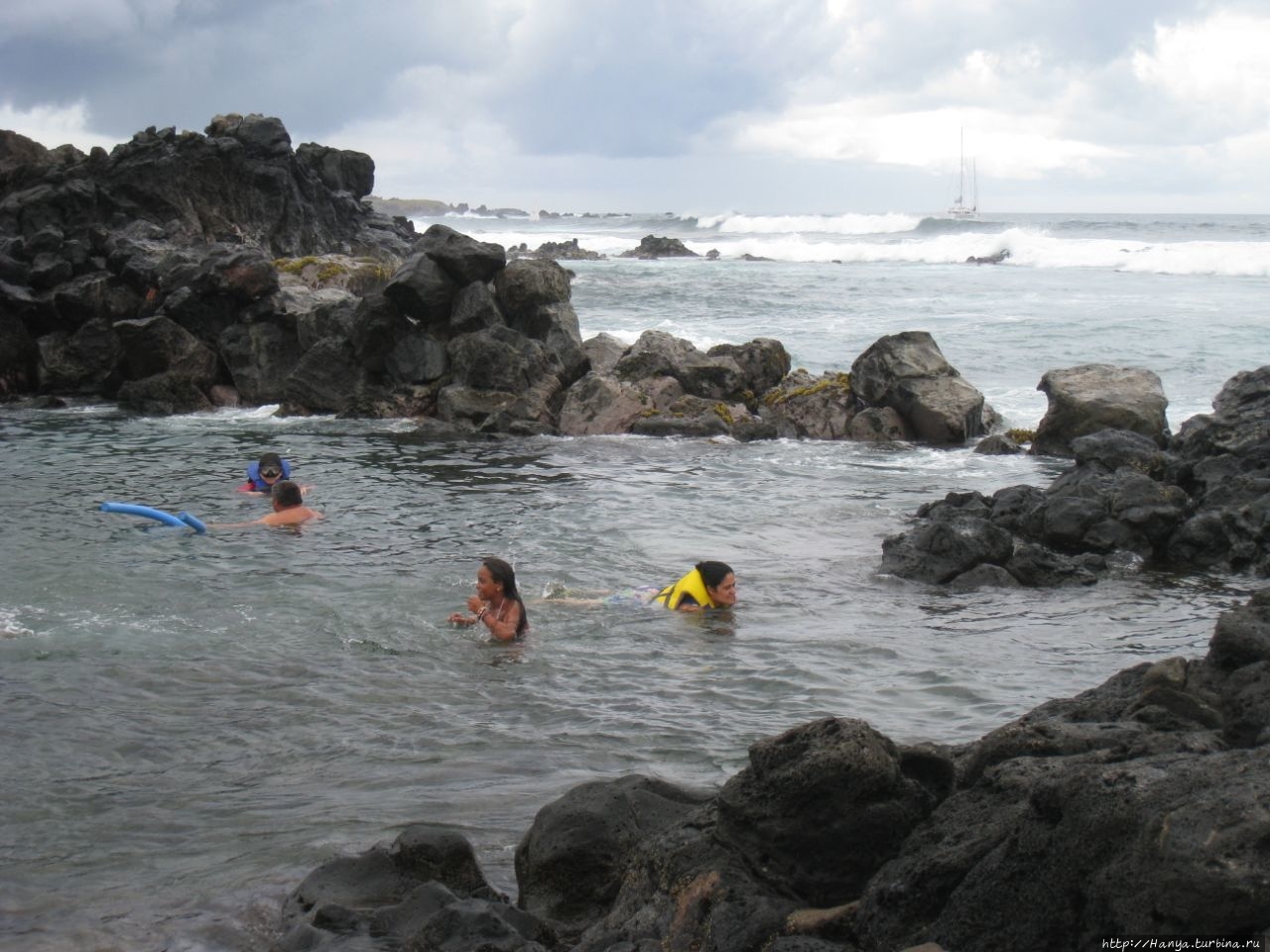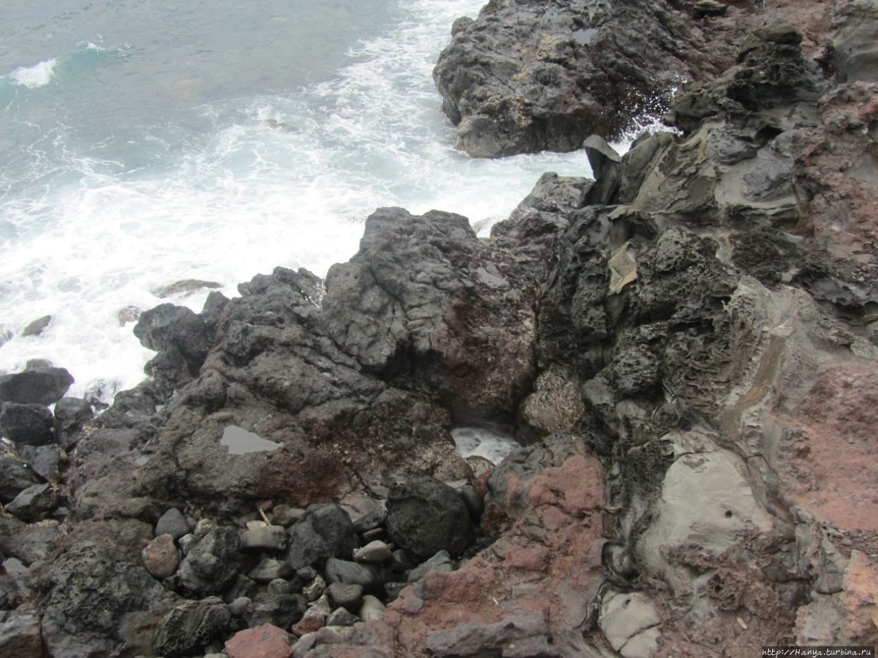Собственно здесь небольшой участок песка, а чаша бассейна находится среди нагромождения камней вулканического происхождения, и ими же она укрыта от прямой океанической волны.