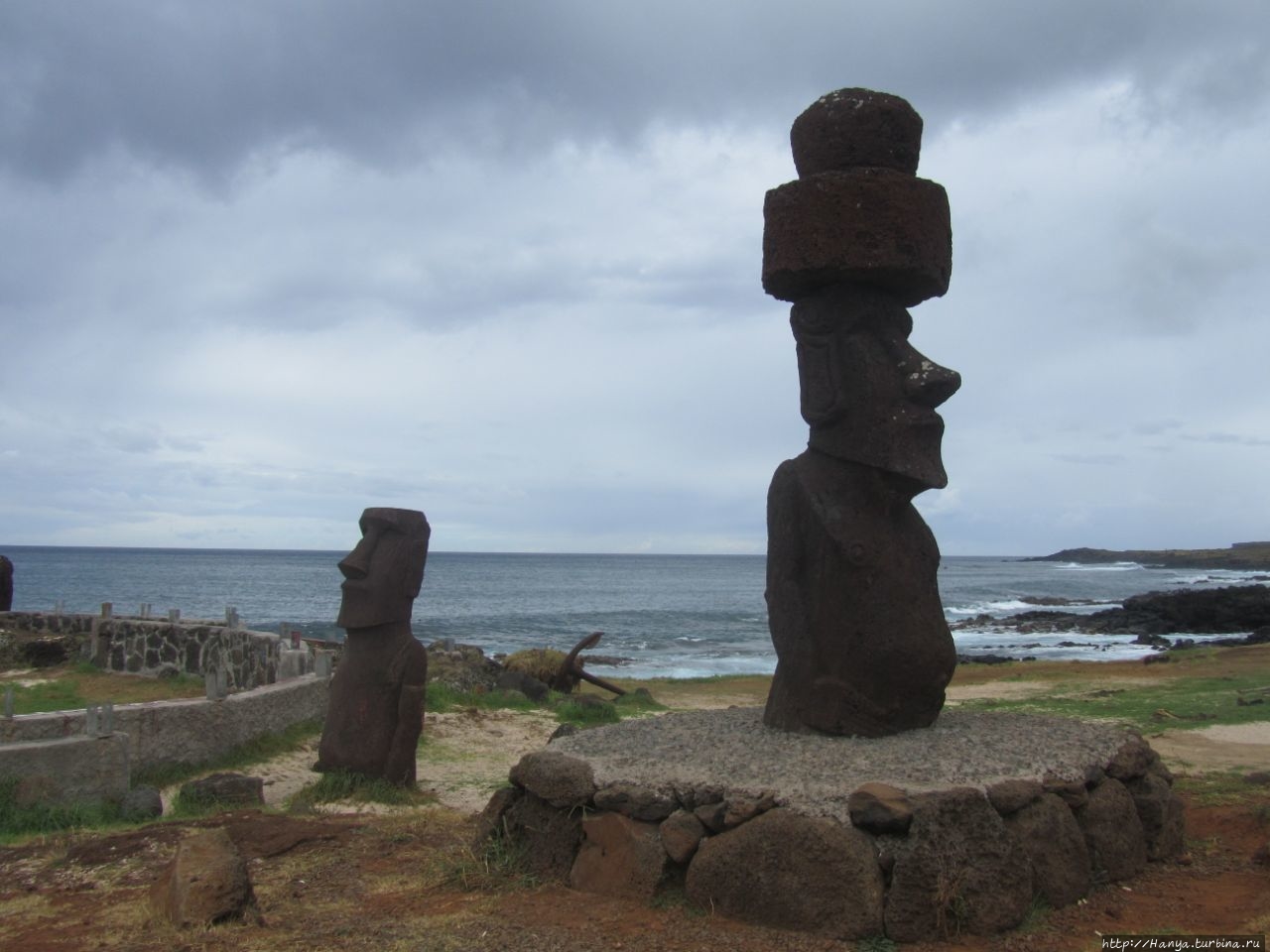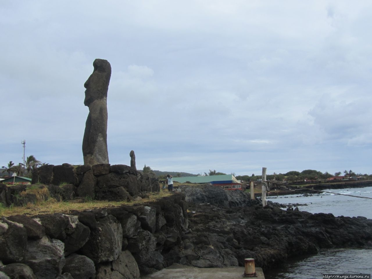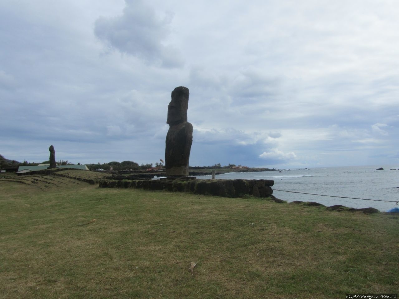 Затем еще раз поворачиваем налево и по широкой улице идем вниз. Десять минут ходу из отеля, и мы на берегу океана, где сразу натыкаемся на двух первых восстановленных истуканов – это Ahu Hotake.