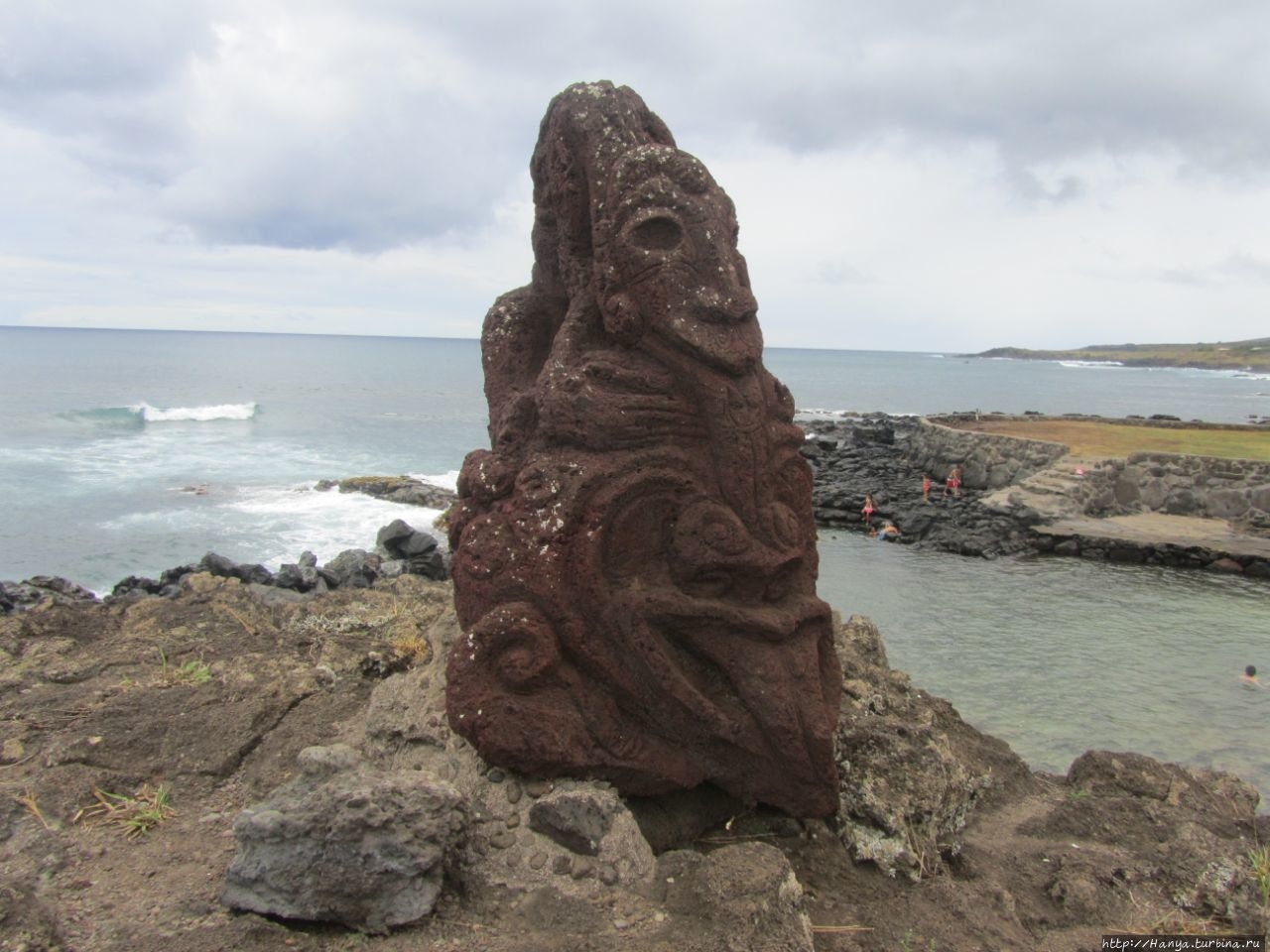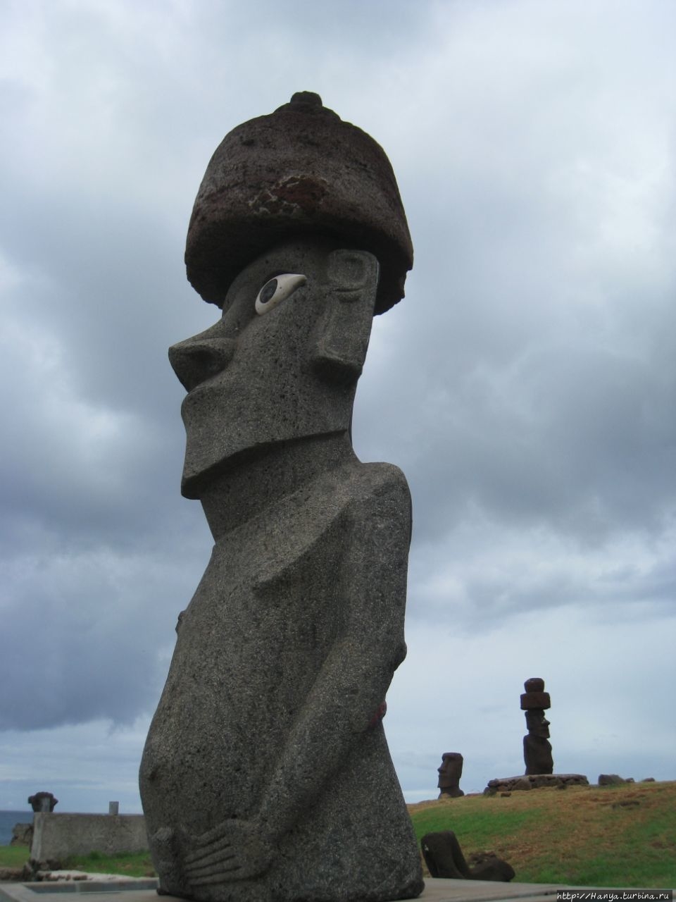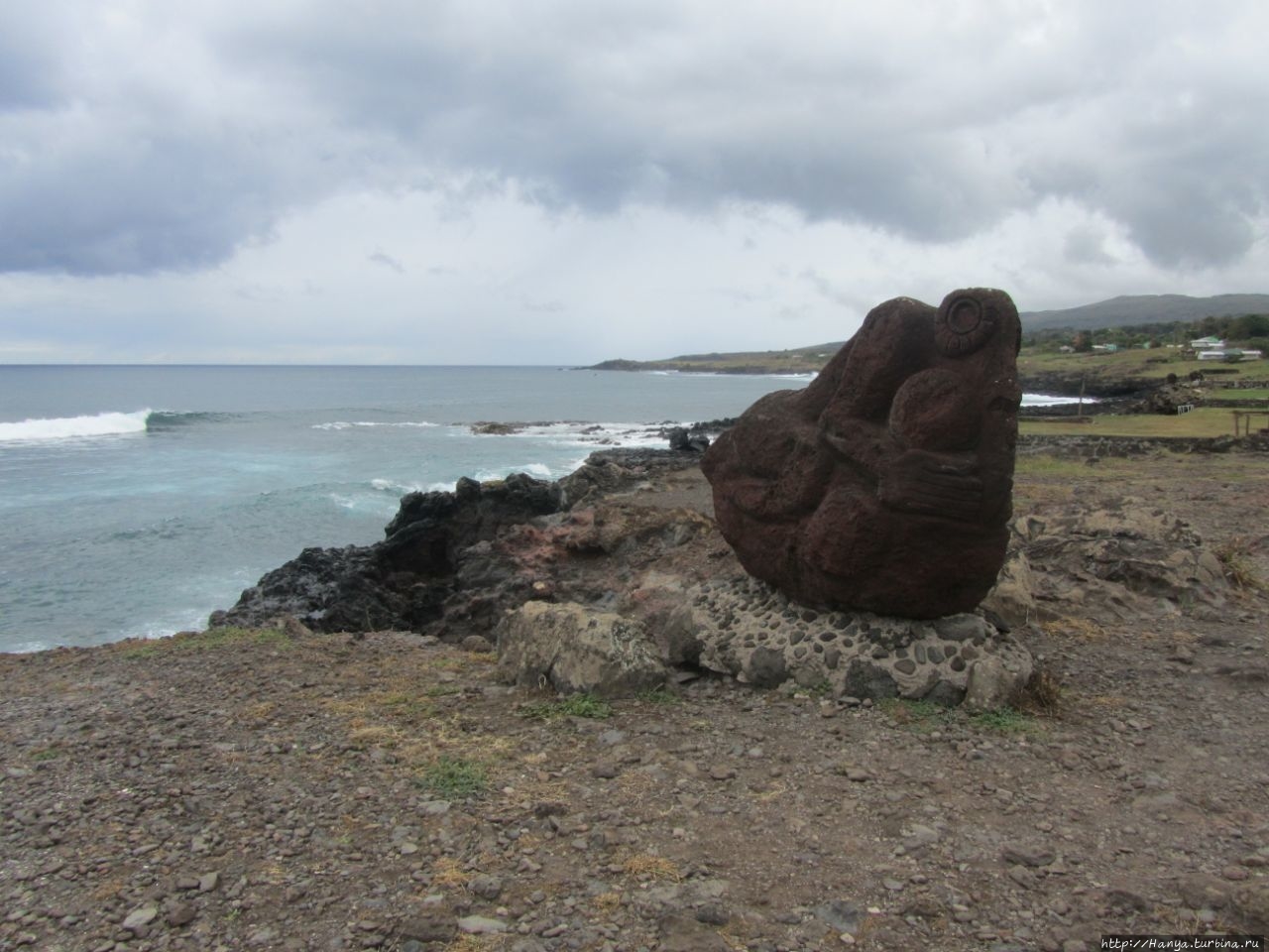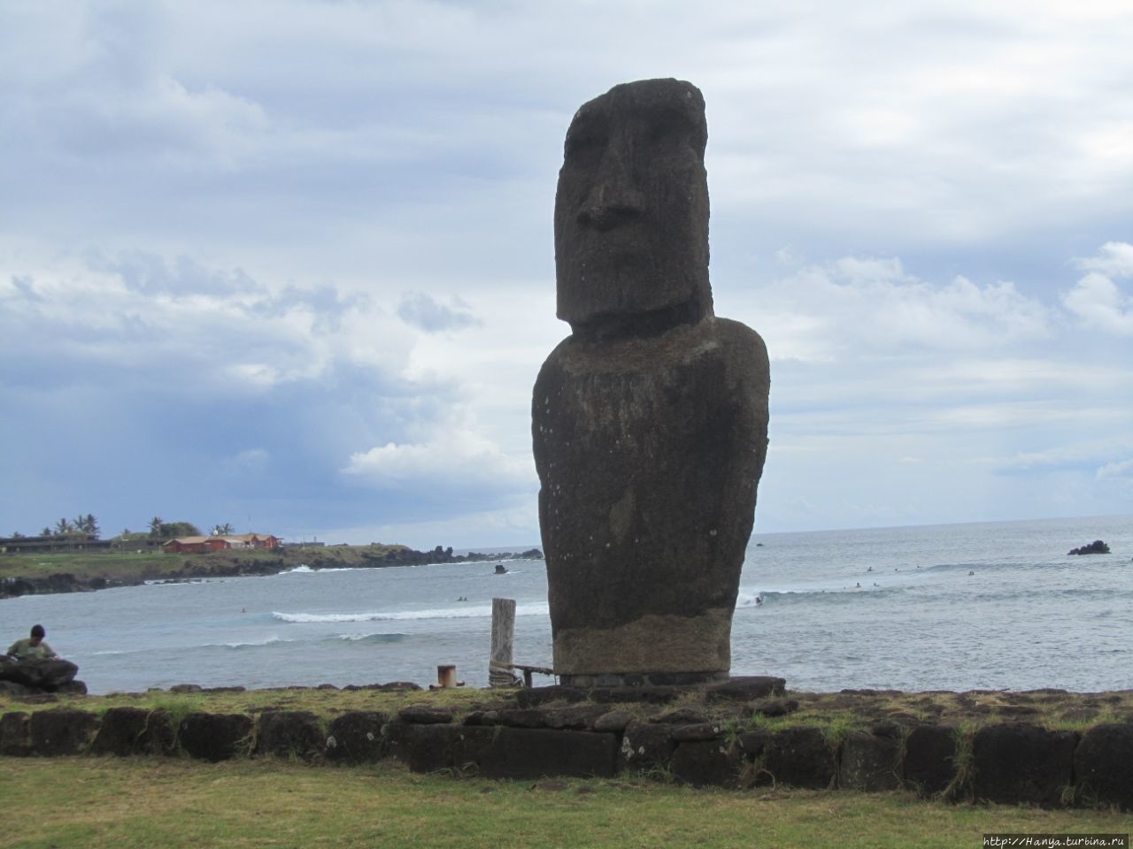 Затем еще раз поворачиваем налево и по широкой улице идем вниз. Десять минут ходу из отеля, и мы на берегу океана, где сразу натыкаемся на двух первых восстановленных истуканов – это Ahu Hotake.