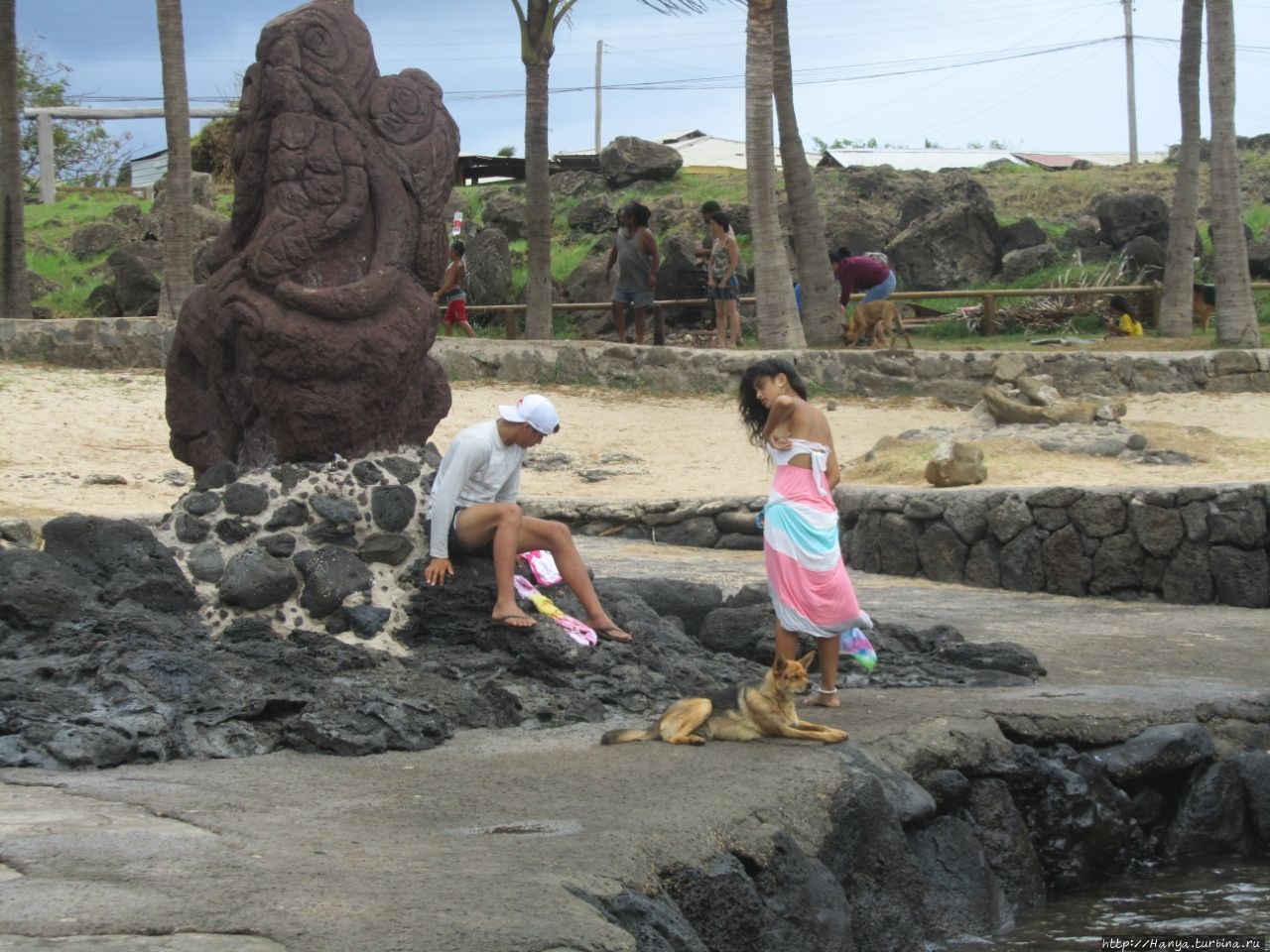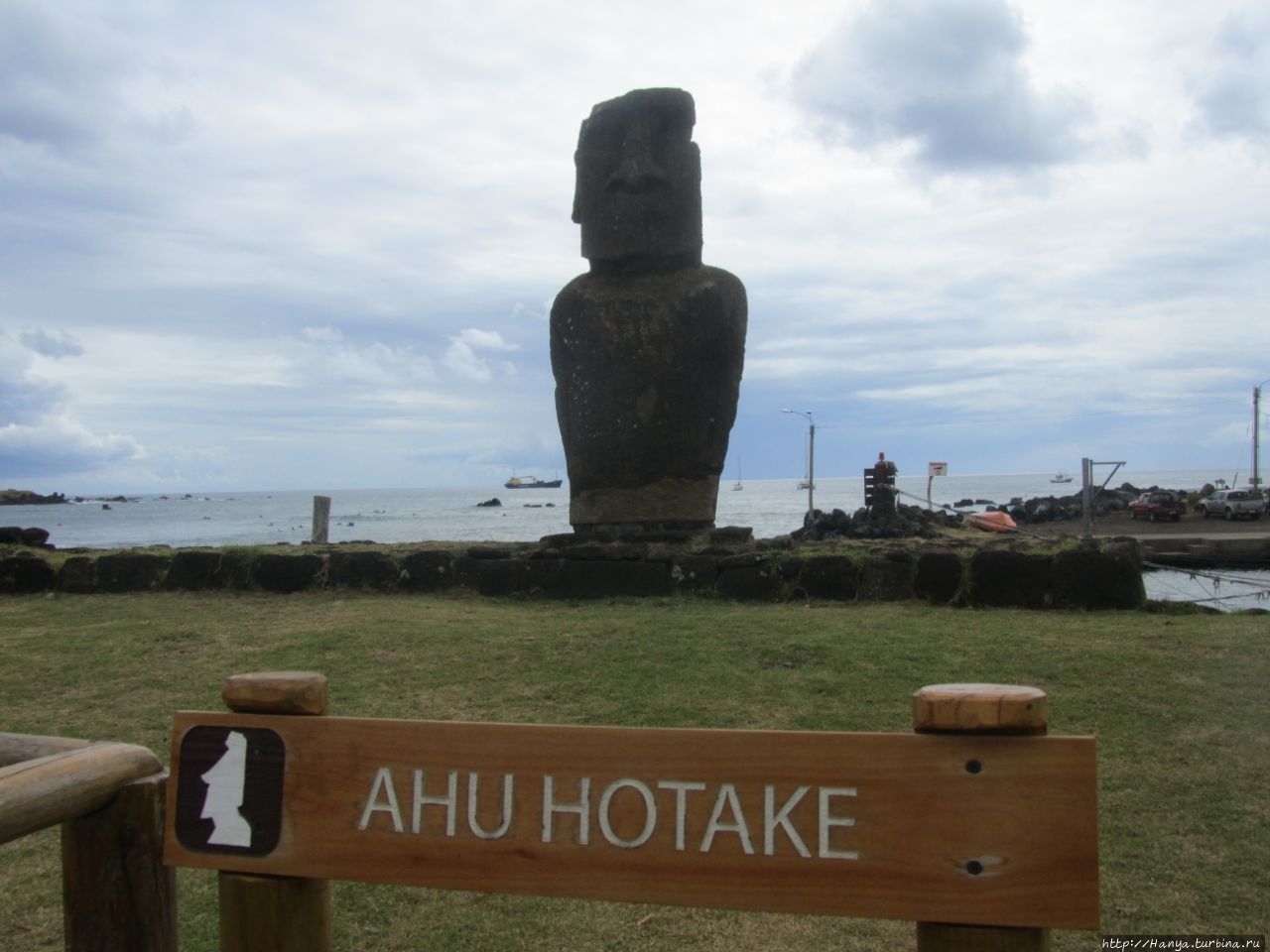 Выбрав поворот направо, мы идем по улице Поликарпо Торо, которая проходит вдоль побережья, и, миновав детскую площадку, примерно в 250 метрах от бухты Ханга Роа Отаи (где находится Аху Хотаке) обнаруживаем целую группу моаи, один из которых снова явный новодел. Правда, это не останавливает нас от фотографирования каждого из них.