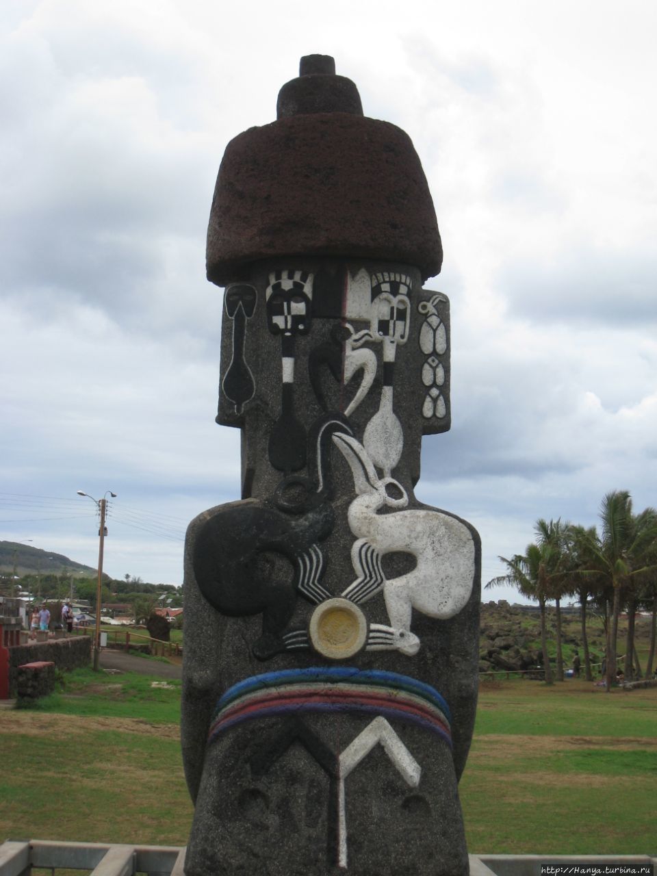 На северном конце Ханга Варе Варе, прежде чем вы дойдете до кладбища, сегодня можно полюбоваться скульптурной композицией под названием "Hitu Merahi", разработанной чилийской художницей Paola Yancovic. Она состоит из семи архангелов, выполненных из металла высотой от 67 до 202 сантиметров, помещенных на полукруг камня. В нашу поездку мы не могли увидеть этот монумент, потому что он был открыт в сентябре 2014 года. Остров Пасхи обладает пальмой первенства, являясь первым местом в мире, где установлены Семь Архангелов, излучающих мир и любовь к человечеству. Фигуры размещены полукругом и обращены к морю, каждый из семи имеет табличку с именем, сам комплекс дополнен двумя пояснительными панелями, с каменными резными фигурками и традиционными надписями, сделанными местными мастерами. Изначально фигуры имели негладкую металлическую поверхность, но более поздние фото говорят о том, что такой вид ангелов не прижился и был заменен традиционными для рапануйцев фигурами. Поскольку сами мы не видели этот монумент, то предоставляю право рассказать о его истории тому, кто увидит Архангелов своими глазами.