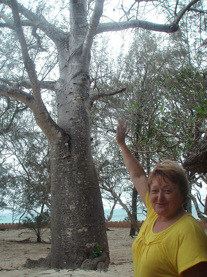 Баобабы, цветущие деревья и веселенькой расцветки дорожки скрашивают темное