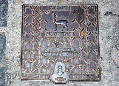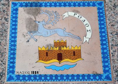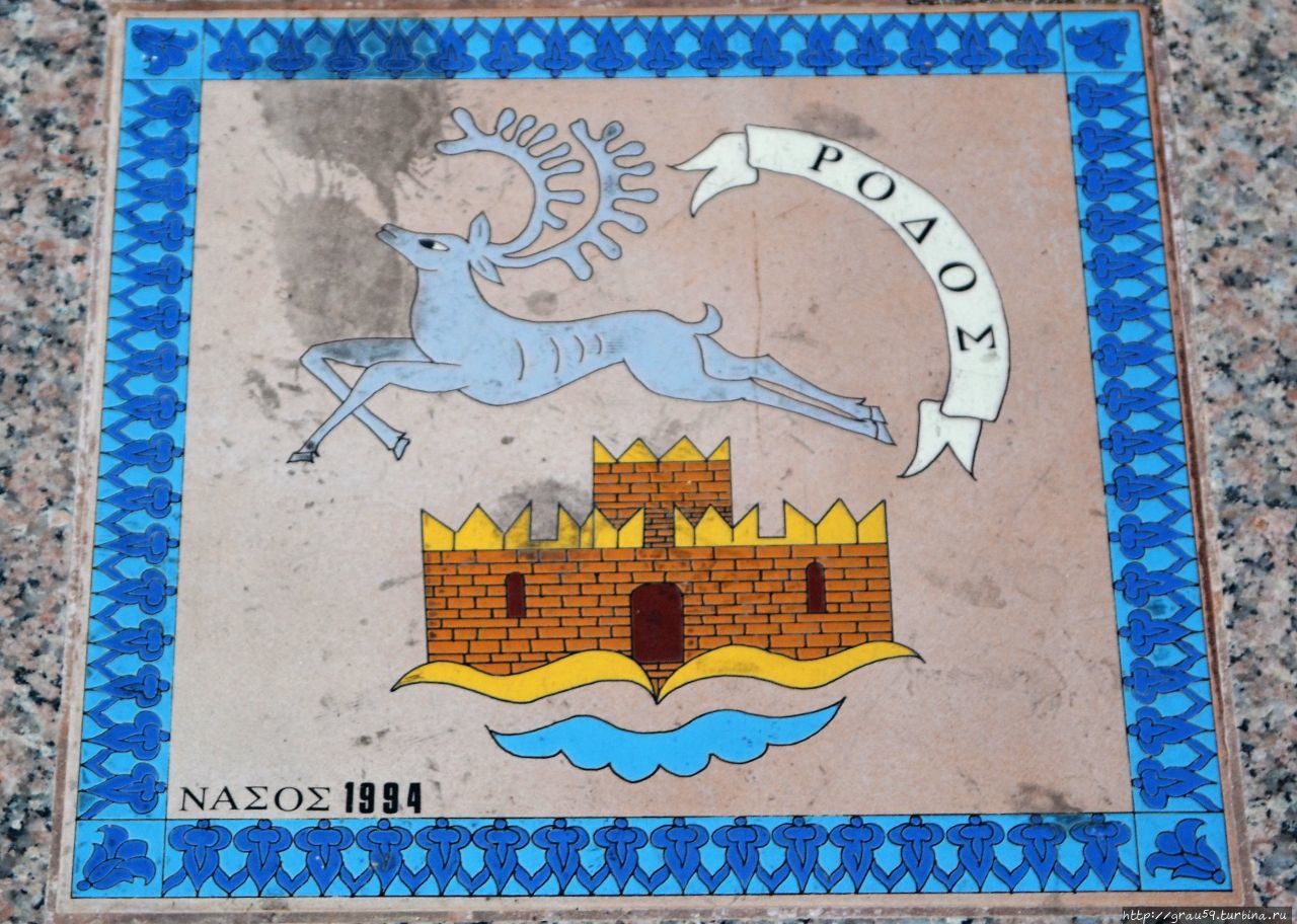 и на аллее, ведущей к аквариуму. Здесь разместились под ногами прохожих гербы островов, входящих в архипелаг Додеканес, герб Родоса был изрядко затоптан и покрыт грязью.Мне показалось, это несколько неуважительным по отношению к гербу и символу города, но потом под ногами олени встречались не раз.