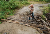Садимся, едем дальше. Опять препятствие — проваленная дорога кем-то "отремонтирована" закидавшими бревнышками. Они сбились и приходится восстанавливать. Мальчики справляются быстро.